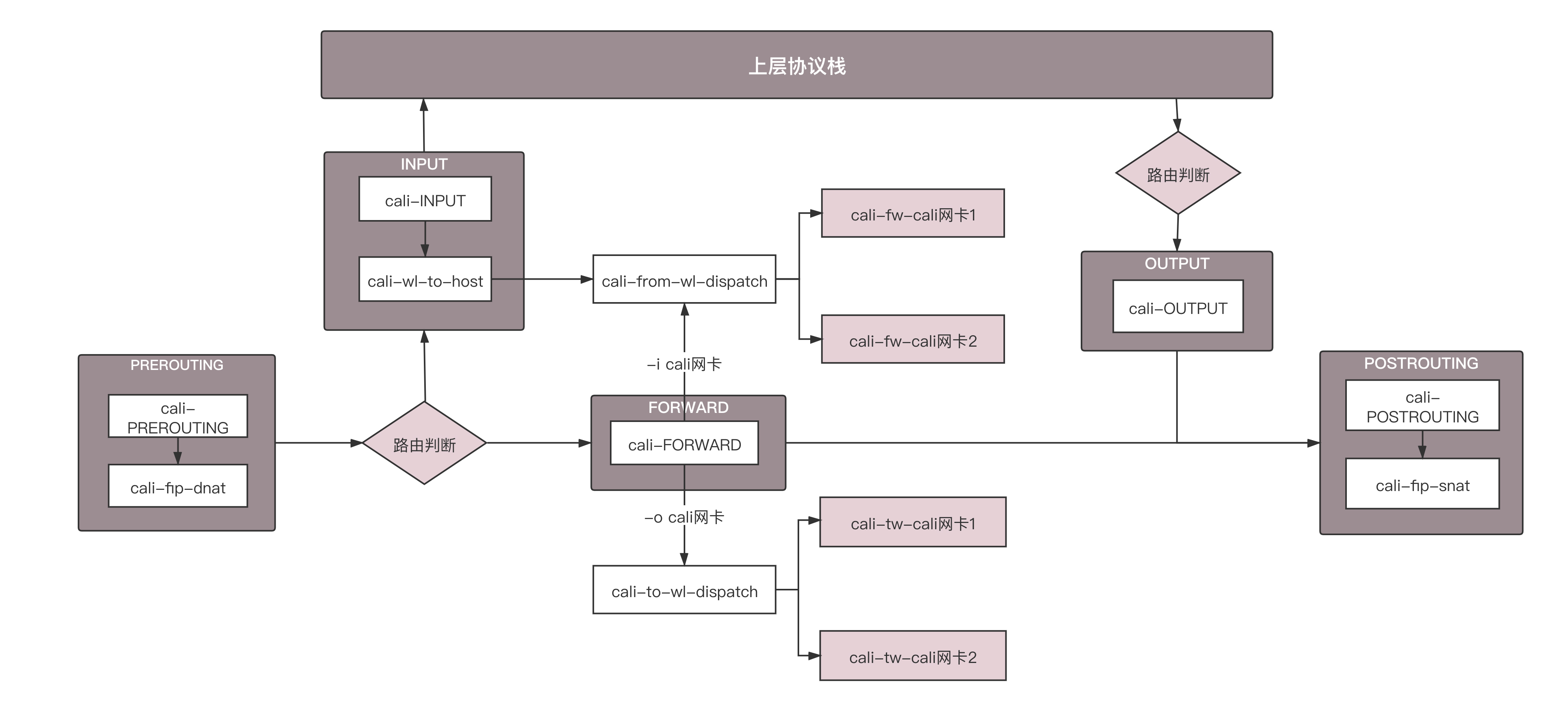 如果是本地的,走INPUT规则,里面有个规则是cali-wl-to-host,wl的意思是workload,也即容器,也即这是用来判断从容器发到物理机的网络包是否符合规则的。这里面内嵌一个规则cali-from-wl-dispatch,也是匹配从容器来的包。如果有两个容器,则会有两个容器网卡,这里面内嵌有详细的规则“cali-fw-cali网卡1”和“cali-fw-cali网卡2”,fw就是from workload,也就是匹配从容器1来的网络包和从容器2来的网络包。