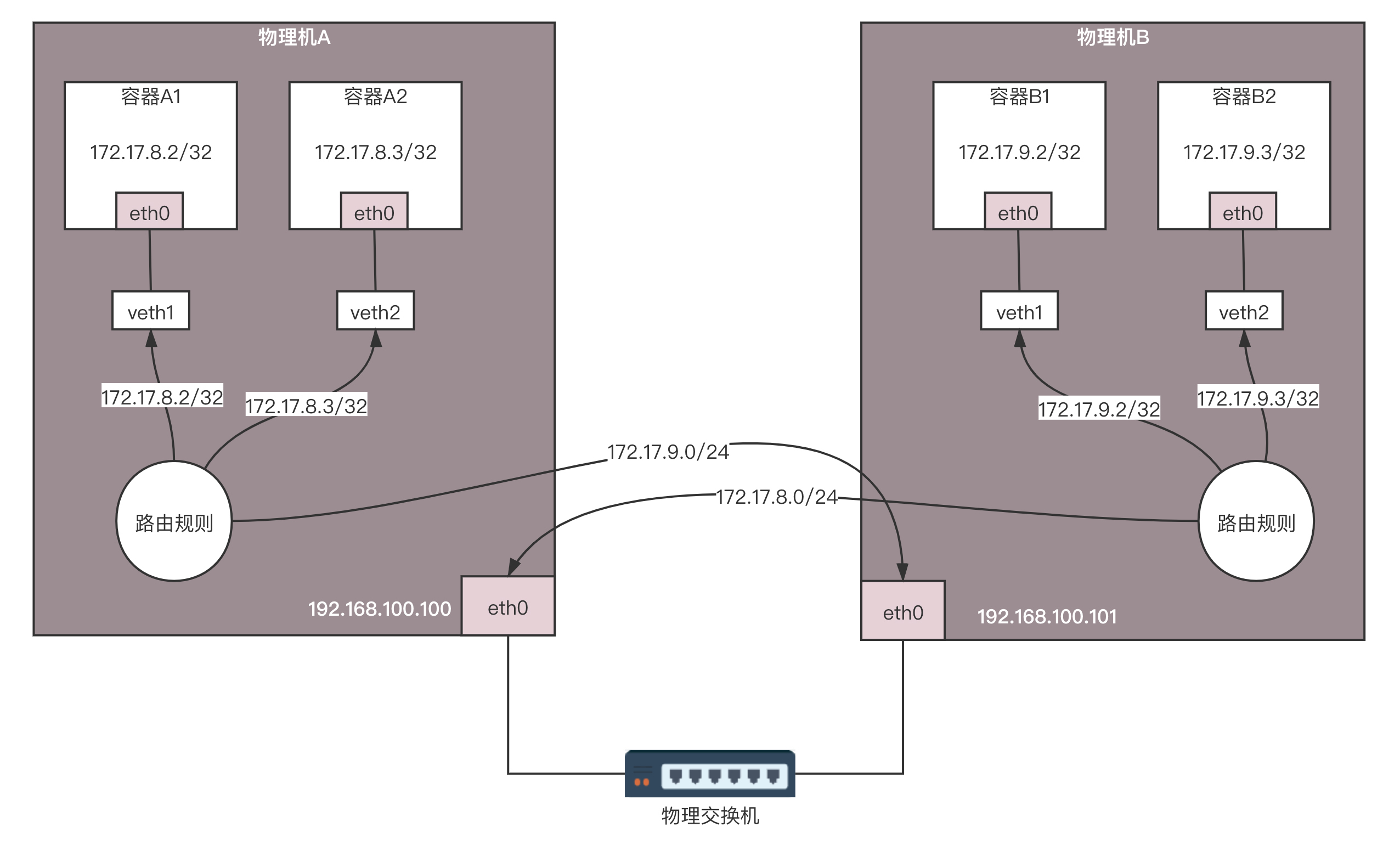 我们看图中的两台物理机。它们的物理网卡是同一个二层网络里面的。由于两台物理机的容器网段不同,我们完全可以将两台物理机配置成为路由器,并按照容器的网段配置路由表。