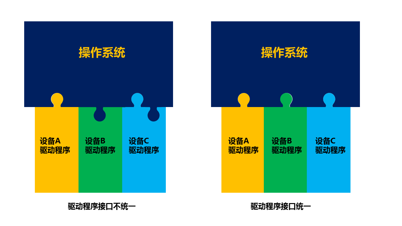 设备驱动程序中是一些面向特殊设备控制器的代码。不同的设备不同。但是对于操作系统其他部分的代码而言,设备驱动程序应该有统一的接口。就像下面图中的一样,不同的设备驱动程序,可以以同样的方式接入操作系统,而操作系统的其他部分的代码,也可以无视不同设备的区别,以同样的接口调用设备驱动程序。