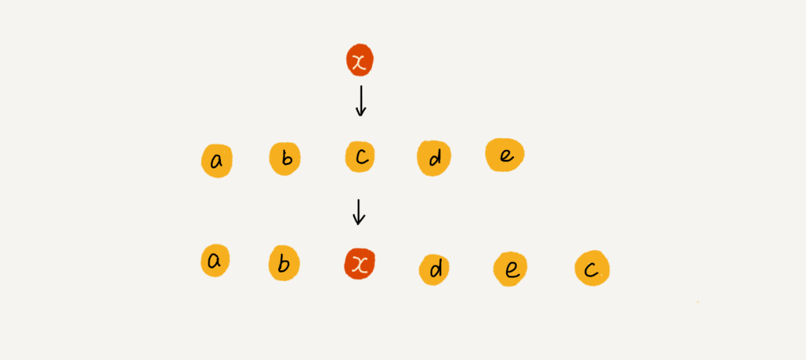 我们现在需要将元素x插入到第3个位置。我们只需要将c放入到a[5],将a[2]赋值为x即可。最后,数组中的元素如下: a,b,x,d,e,c。