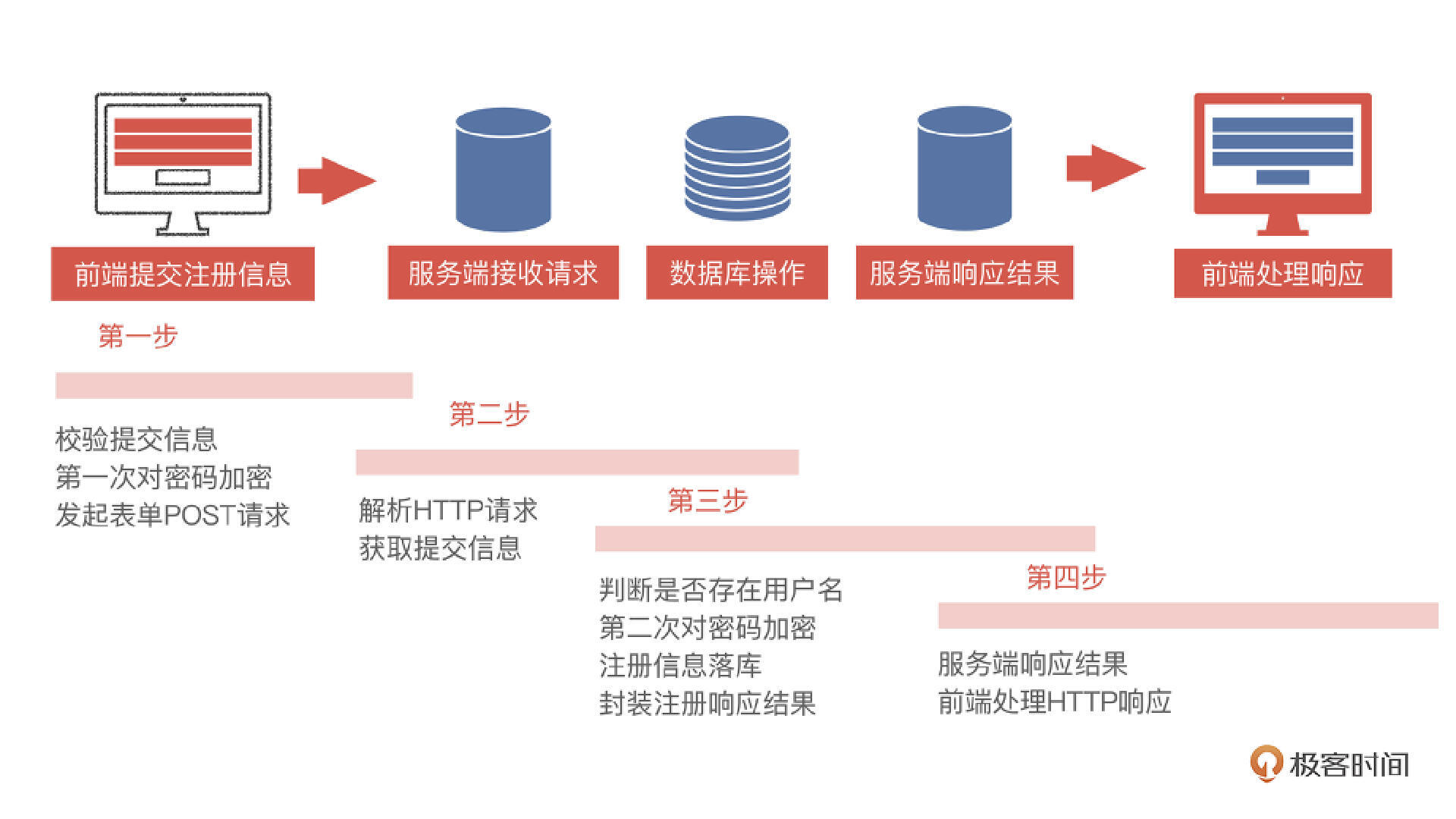 经过今天的学习,相信你已经掌握了用户注册和登录的全栈功能实现。我们基于运营搭建平台这个案例,分析了Web平台常见的用户注册和登录功能,类似的从前端到服务端的全栈技术实现流程主要可以分成三步。