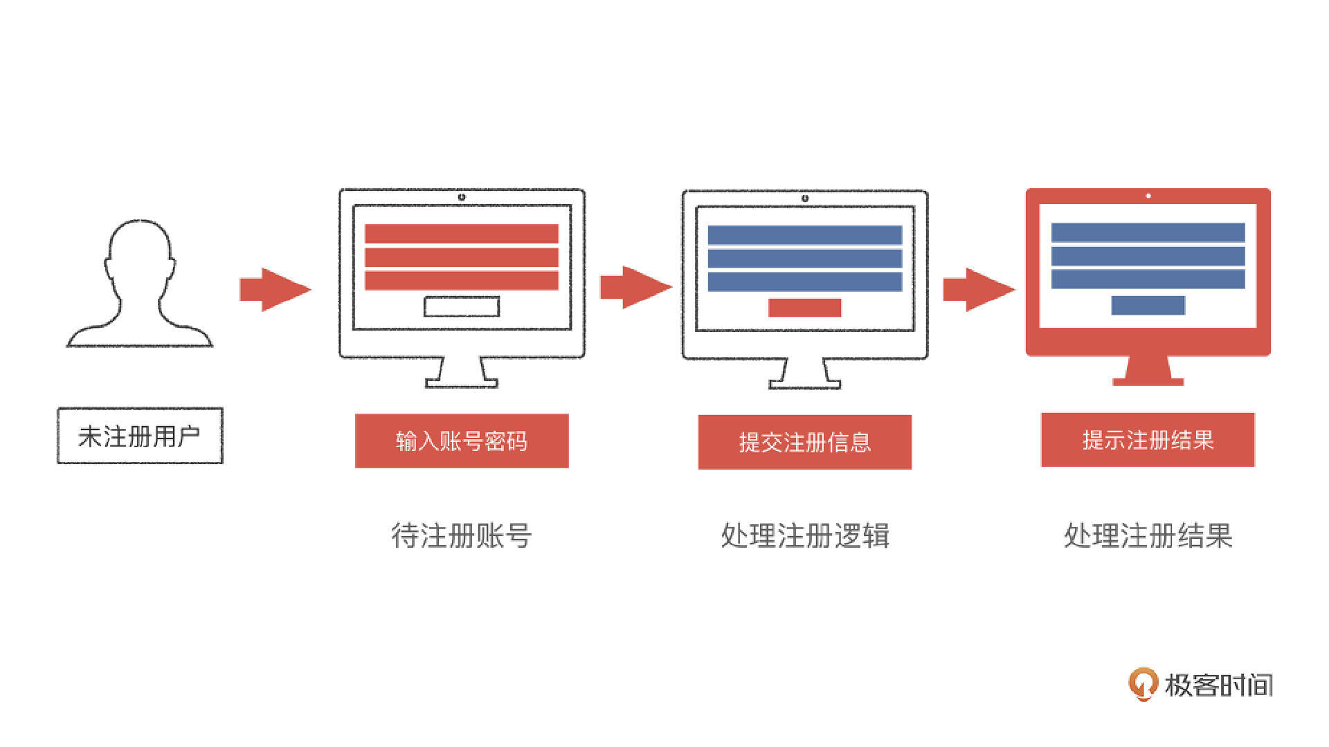 - 第二步,用户提交注册信息,处理注册逻辑。这时候要平台判断账号是否存在,判断是否能注册,并处理注册结果。如果用户名称已存在,就准备好失败提示结果,如果用户名称不存在,就注册用户信息。