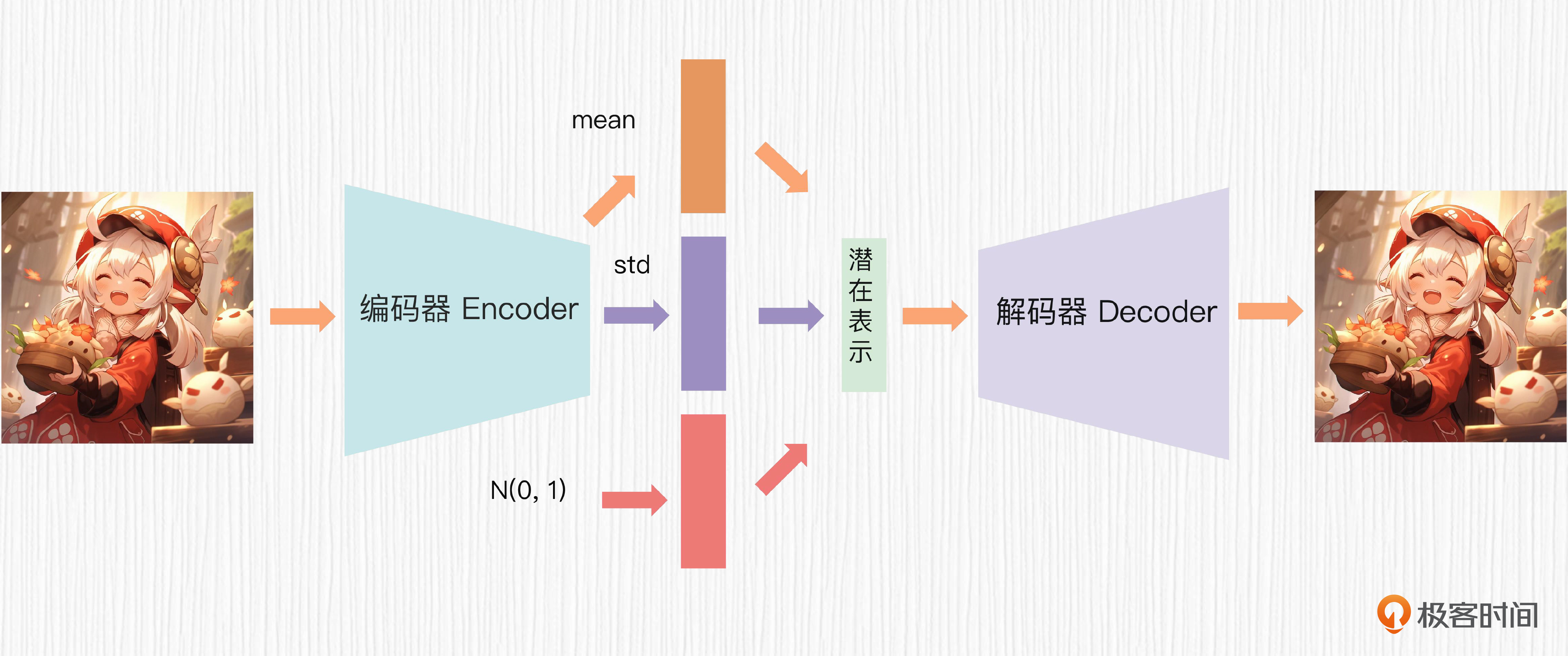 提到编码器和解码器,你也许会联想到我们在[第7讲]中学过的Transformer结构。这里我需要提醒你注意,尽管术语一样,但是VAE和Transformer中的编码器、解码器解决的是不同类型的问题,并具有不同的结构和原理。