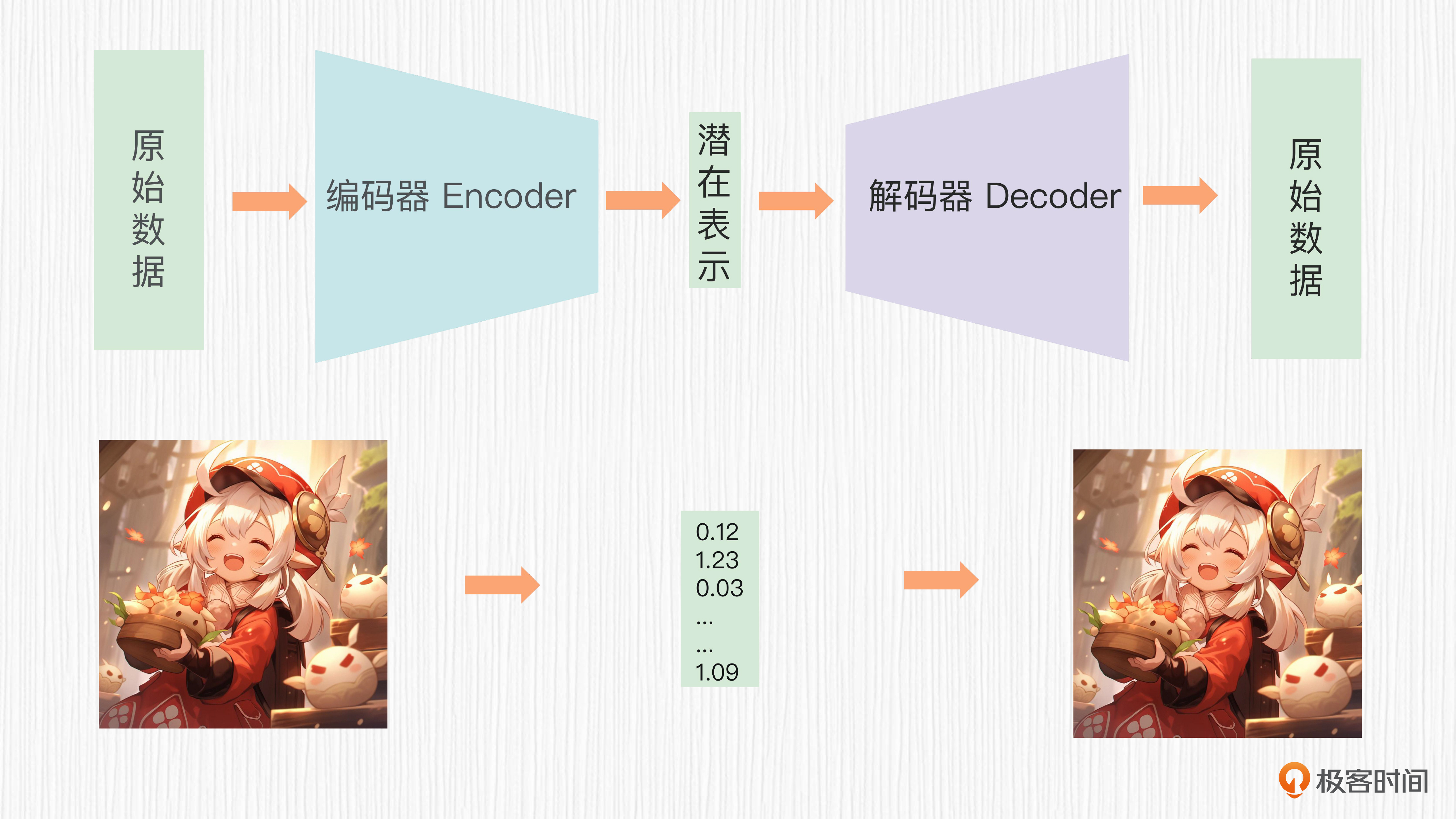 以VAE为代表的 “AE” 系列工作,都是希望编码器将原始数据编码成低维的潜在表示,并且这个潜在表示可以通过解码器近乎无损地恢复出原始数据。这里的原始数据,可以是图像、文本等多种模态。
