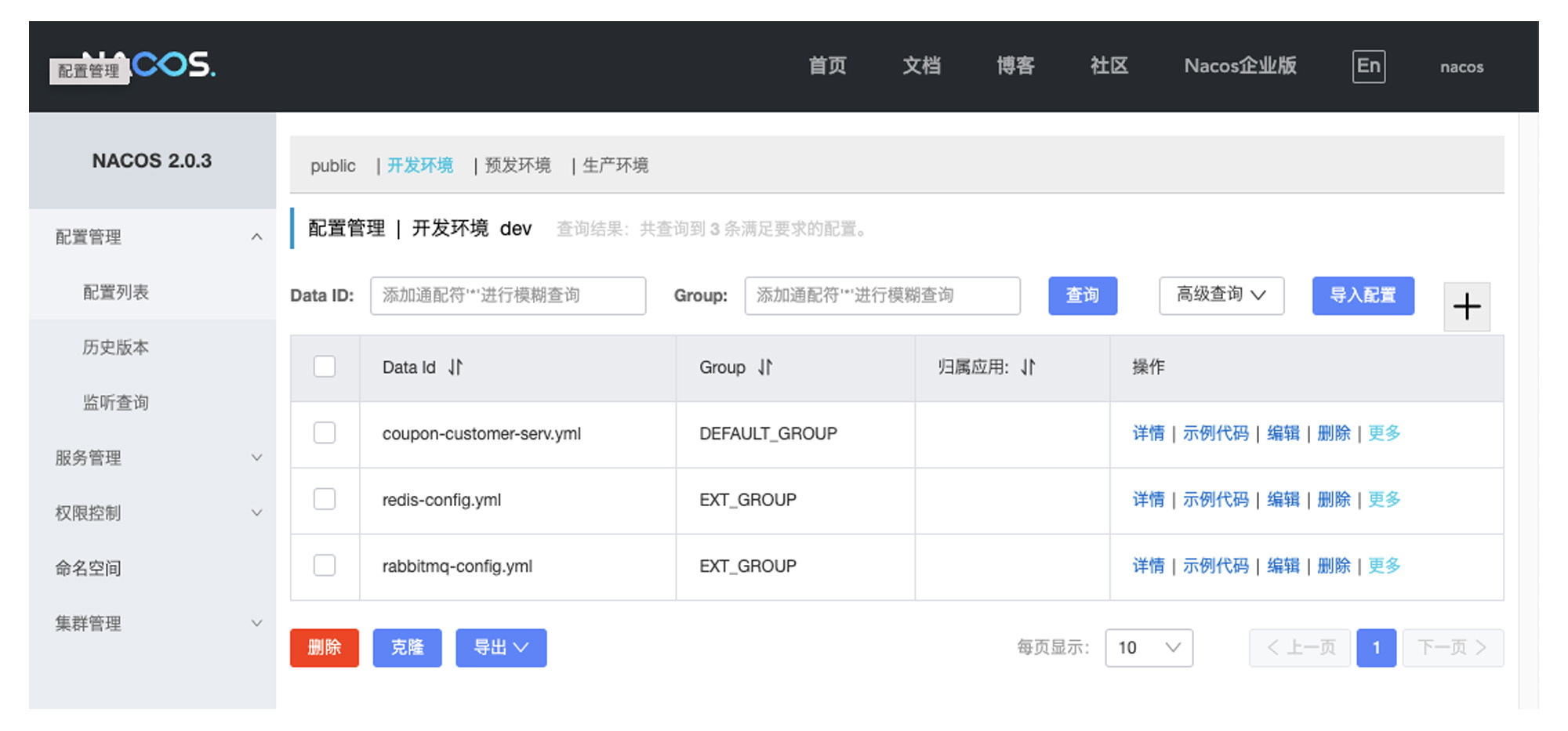 首先,我们在本地启动Nacos服务器,打开配置管理模块下的“配置列表”页面,再切换到“开发环境”命名空间下(即dev环境)。