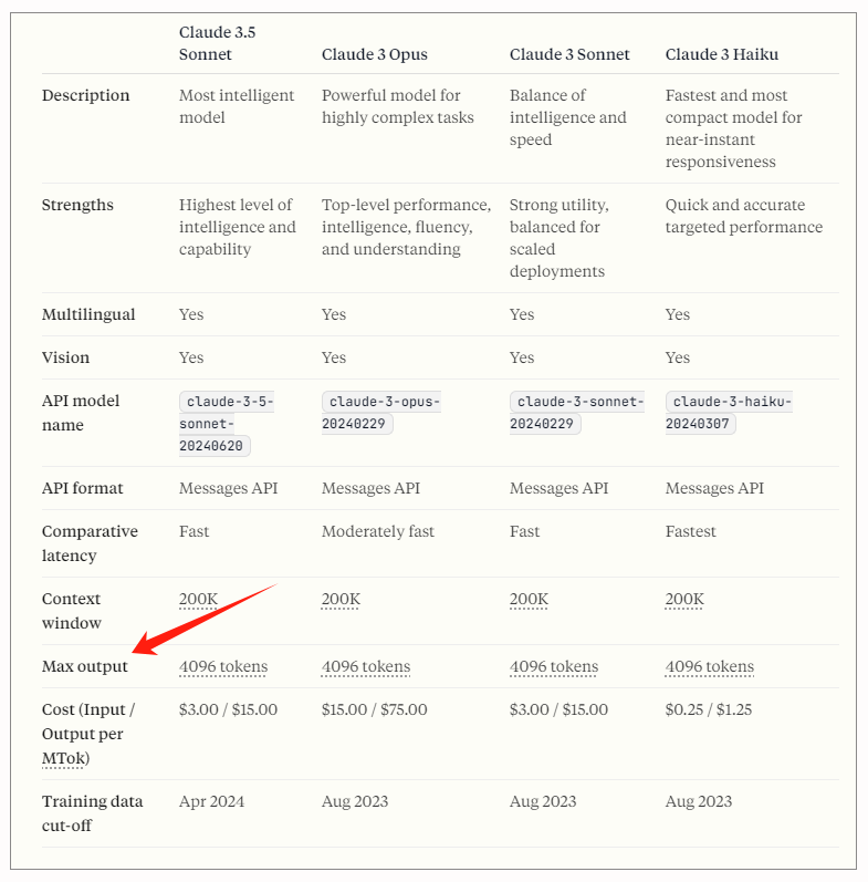 但是,对于有些模型来说,比如Claude家族的模型,它的最大输出长度就是有限制的,目前是4096个Token,也就是说,虽然模型可以读入很长的上下文,但是能够输出的内容,只有4096这么多。