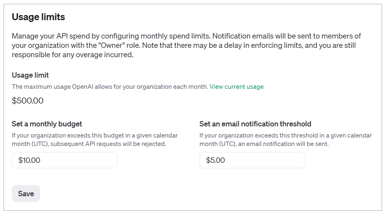 为了监控成本,你可以在帐户中设置阈值,一旦超过某个使用阈值就会收到电子邮件,提醒你本月已经消耗了多少银子。你还可以设置每月预算,一旦使用时的费用超出预算,API就停工。我这里,就设了一个5元的提醒和每月10元的预算。对于学习者来说,这也就够用了,但是如果达到预算上限,你的应用程序可能会被迫中断。