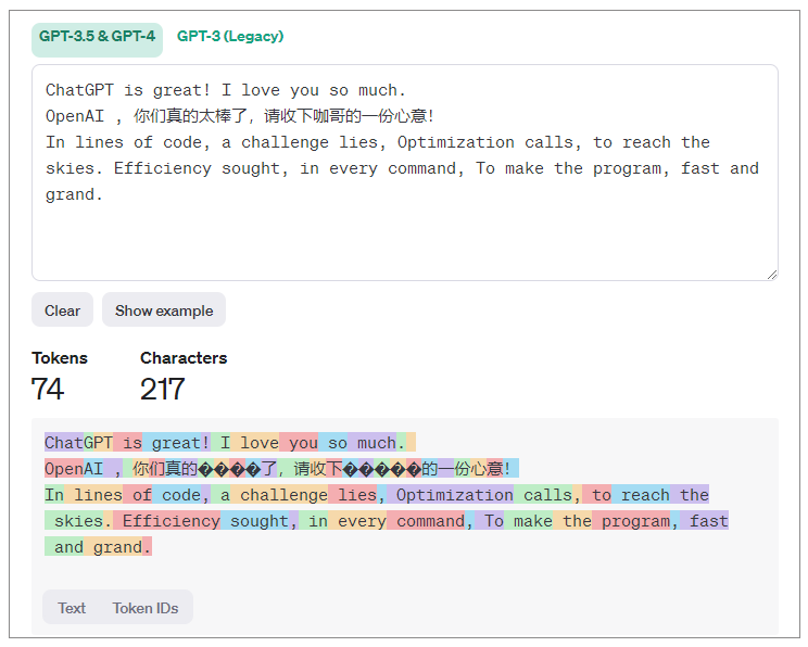 OpenAI提供了一个 tokenizer 工具来帮助我们估算Token数量。在这个页面中,我们输入文本,OpenAI就会显示GPT模型将如何把输入文本转换为一个个的Token。