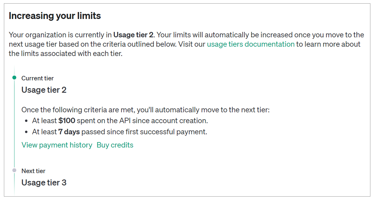 OpenAI采用了分层的使用限制策略。随着用户对API的使用量和支出增加,系统会自动将用户升级到更高的使用层级。例如,从免费层级到第五层级,每月的使用限额从100美元逐步增加到50,000美元。每个层级都有其特定的资格要求和相应的限制标准。