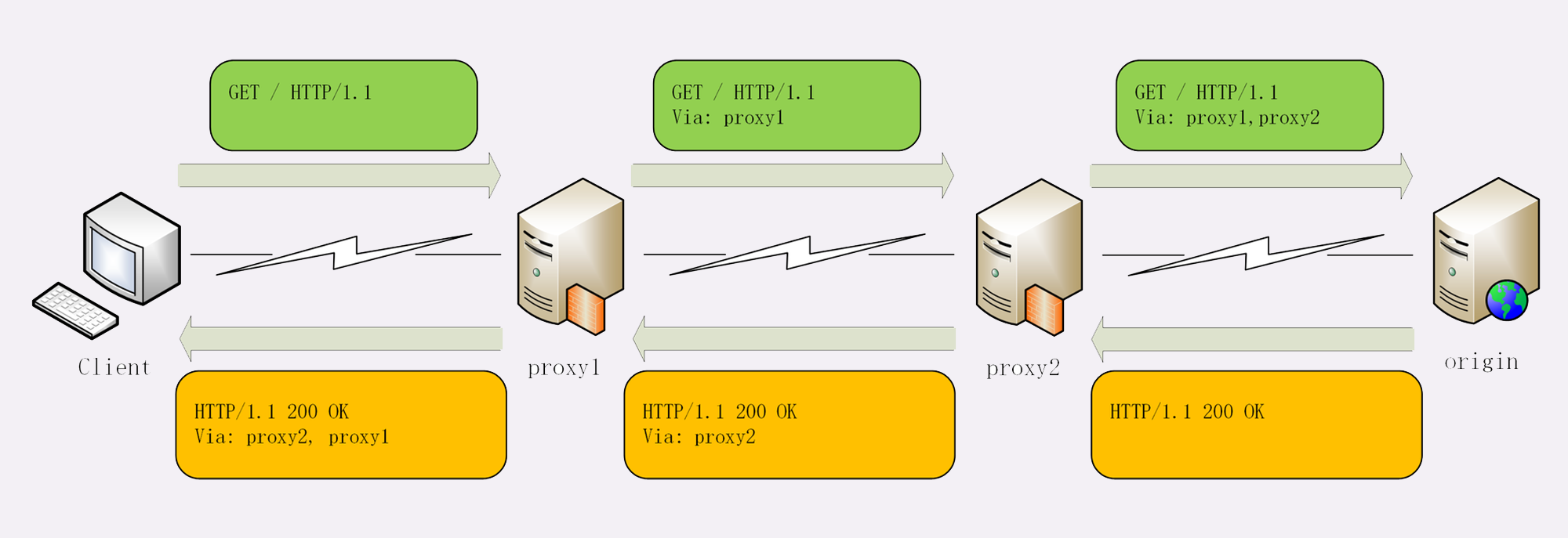 例如下图中有两个代理:proxy1和proxy2,客户端发送请求会经过这两个代理,依次添加就是“Via: proxy1, proxy2”,等到服务器返回响应报文的时候就要反过来走,头字段就是“Via: proxy2, proxy1”。