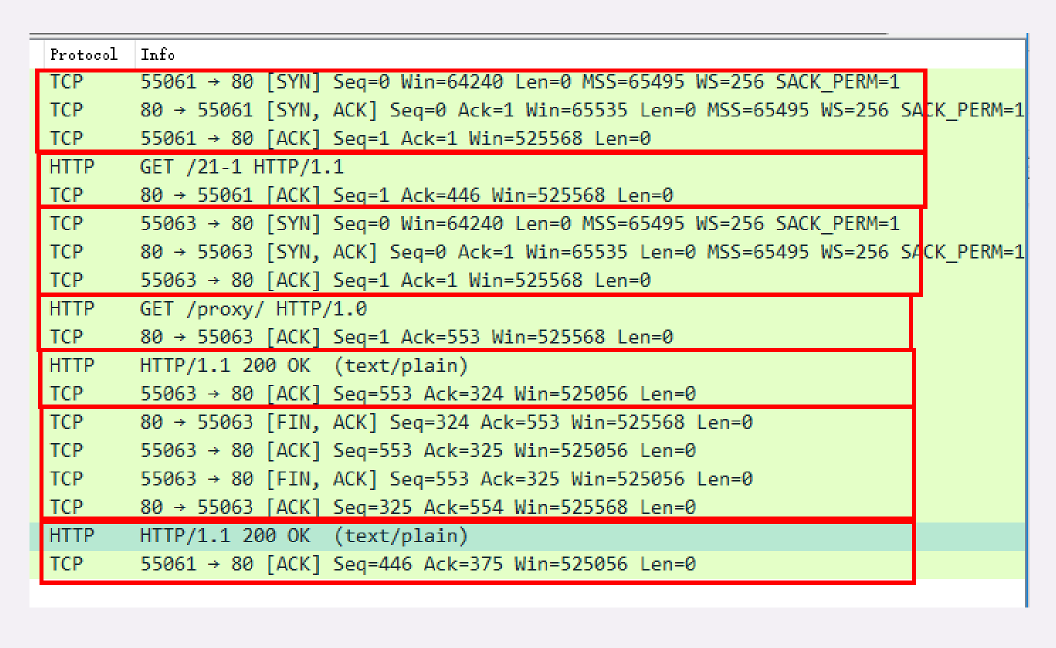 - 代理不直接生产内容,所以就代表客户端,用55063端口连接到源服务器,也是三次握手;