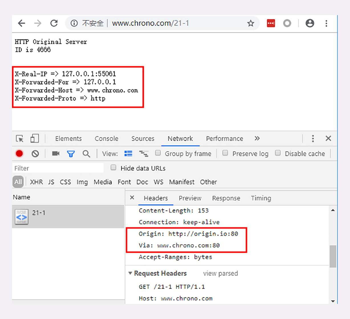 我们的实验环境实现了一个反向代理,访问“http://www.chrono.com/21-1”,它会转而访问“http://origin.io”。这里的“origin.io”就是源站,它会在响应报文里输出“Via”“X-Forwarded-For”等代理头字段信息: