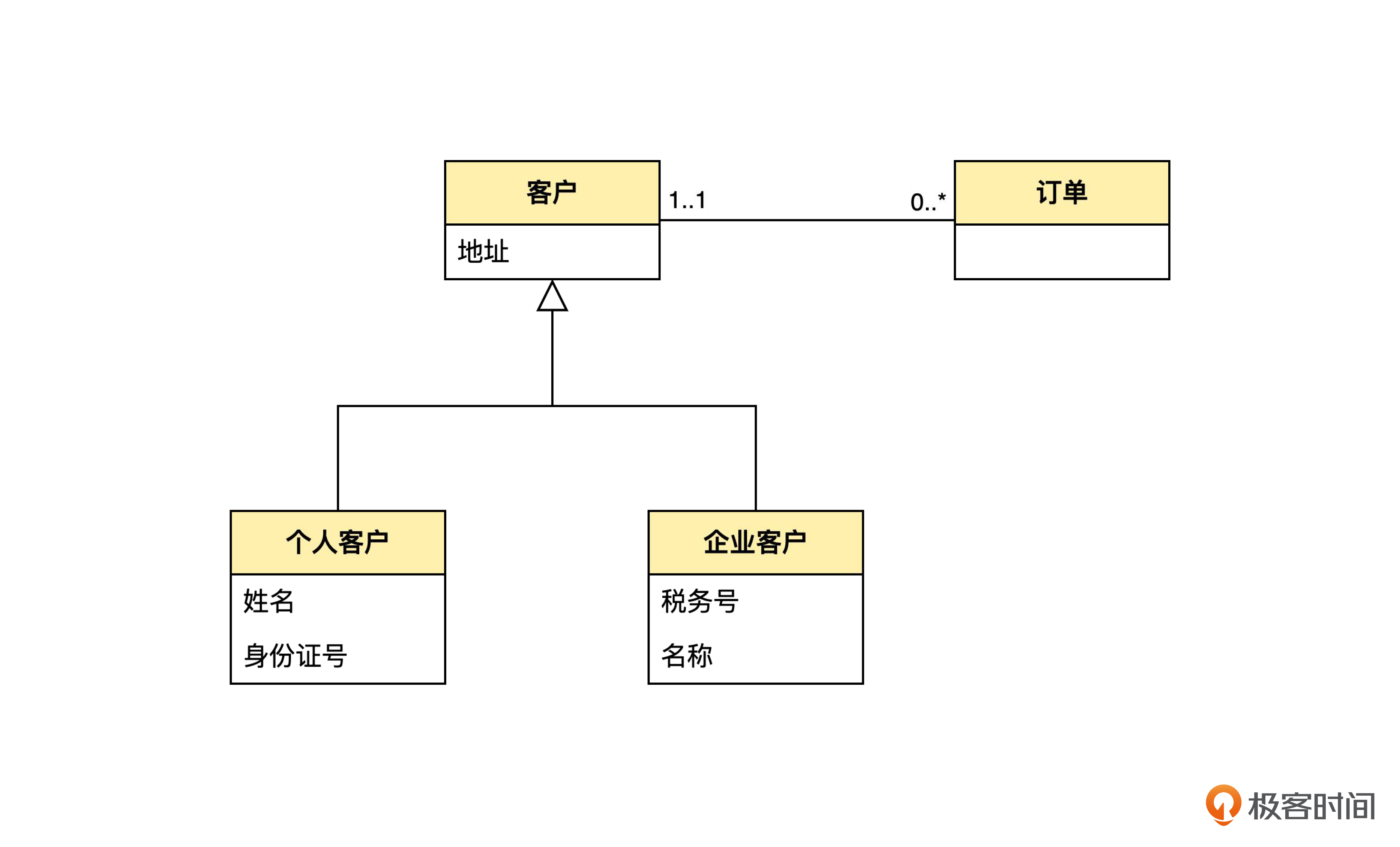 这个领域模型,说的是一个商家可以把商品卖给个人或者企业。也就是说,个人客户和企业客户都是客户。所以可以抽取出泛化关系。客户实体里的送货地址属性,以及客户和订单之间的一对多关联,都体现了个人客户和企业客户的共性。而个人客户里的姓名、企业客户里的税务号等属性,体现了个人客户和企业客户的区别。