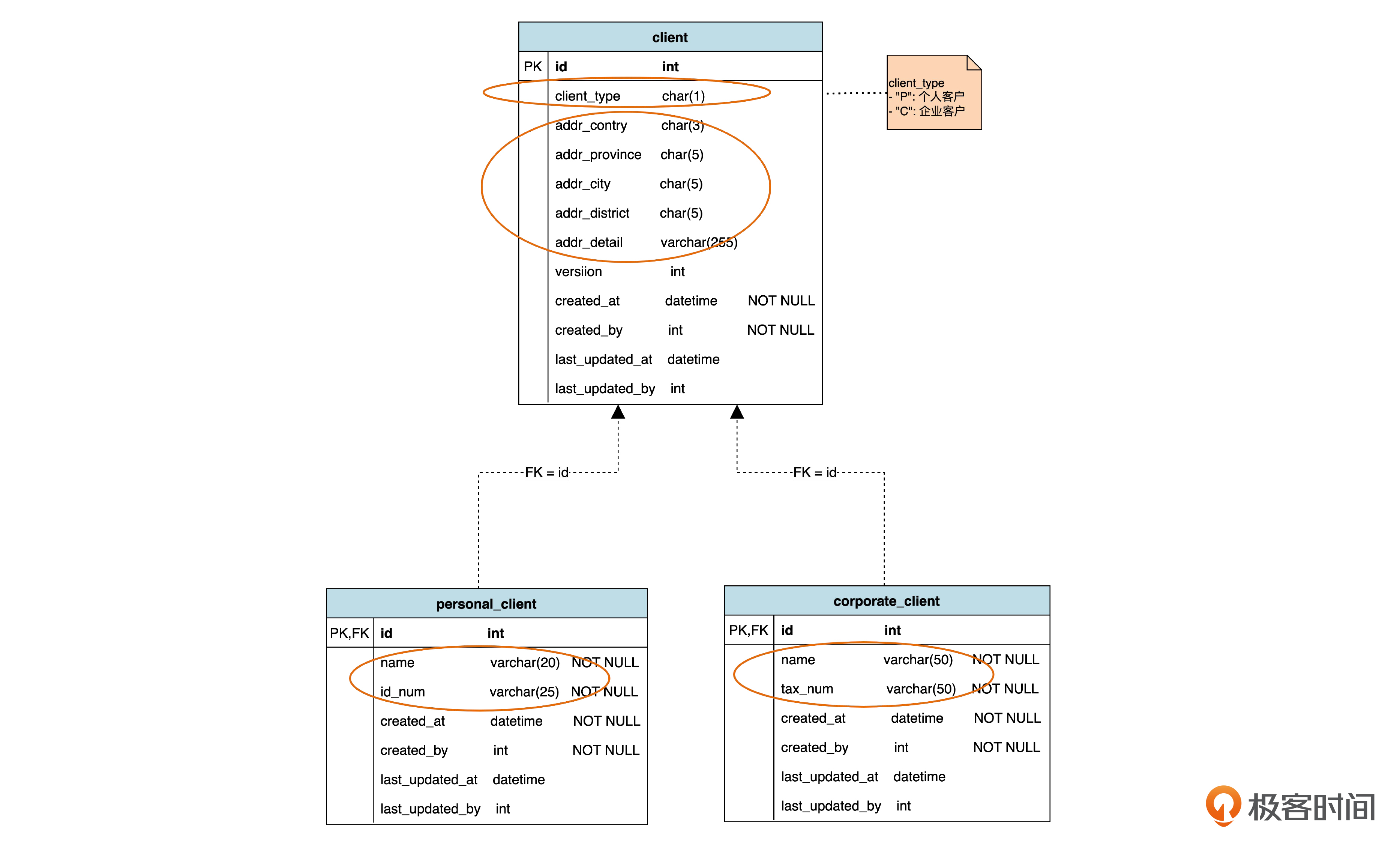 我们看到,这个表里包括公共属性,也就是地址相关的属性;个人客户独有的属性,也就是姓名和身份证号,以及企业客户独有的属性,包括企业名称和税务号。由于个人客户姓名和企业客户名称都在同一个表里,所以不能都命名为“name”了,要用 personal_name 和 corporate_name 区分开。另外,client_type(客户类型)也是需要的。