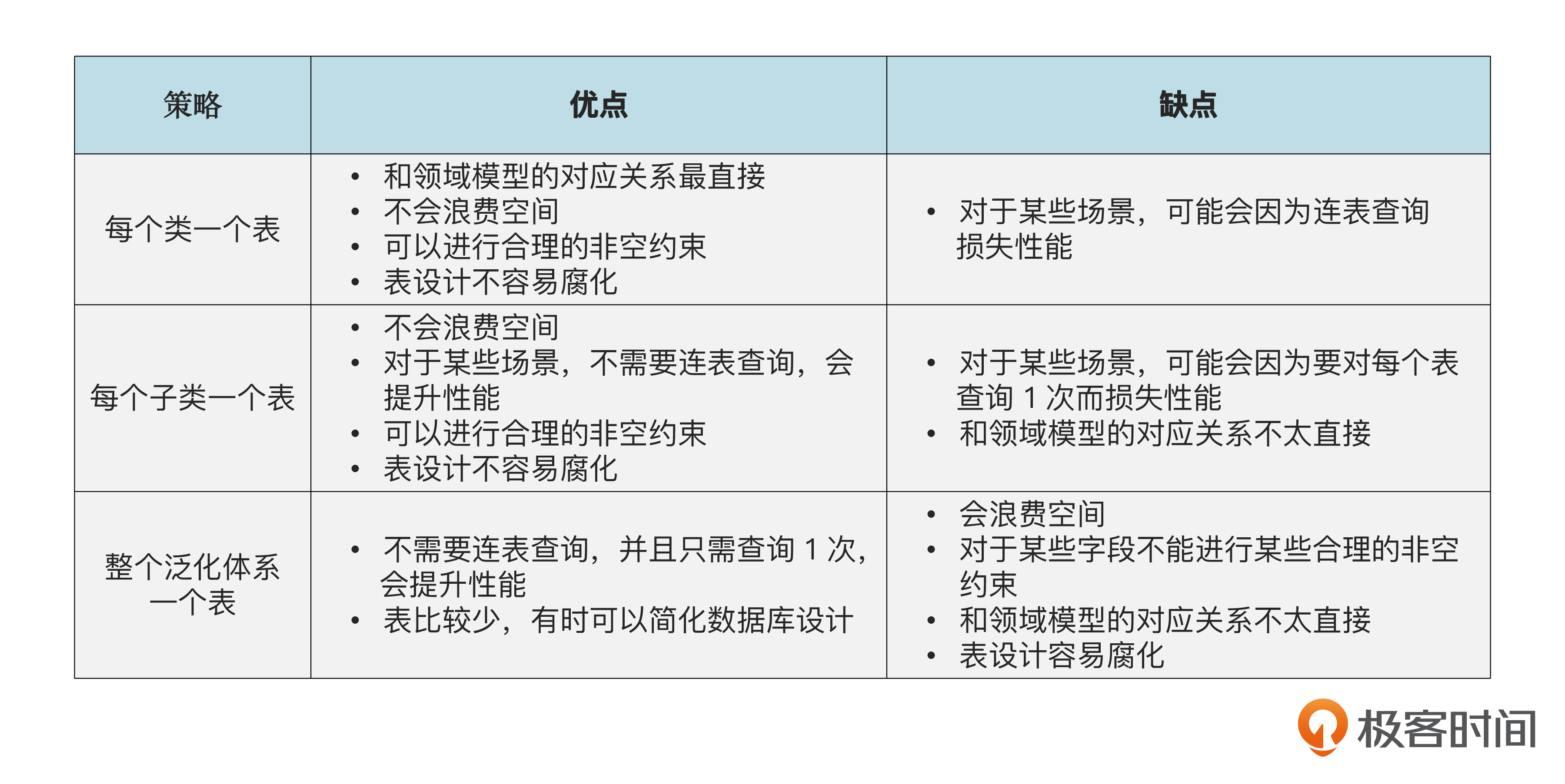 既然有这 3 种设计表的策略,我们在实践中应该怎么选择呢?这需要考虑若干个维度,没有唯一的答案。