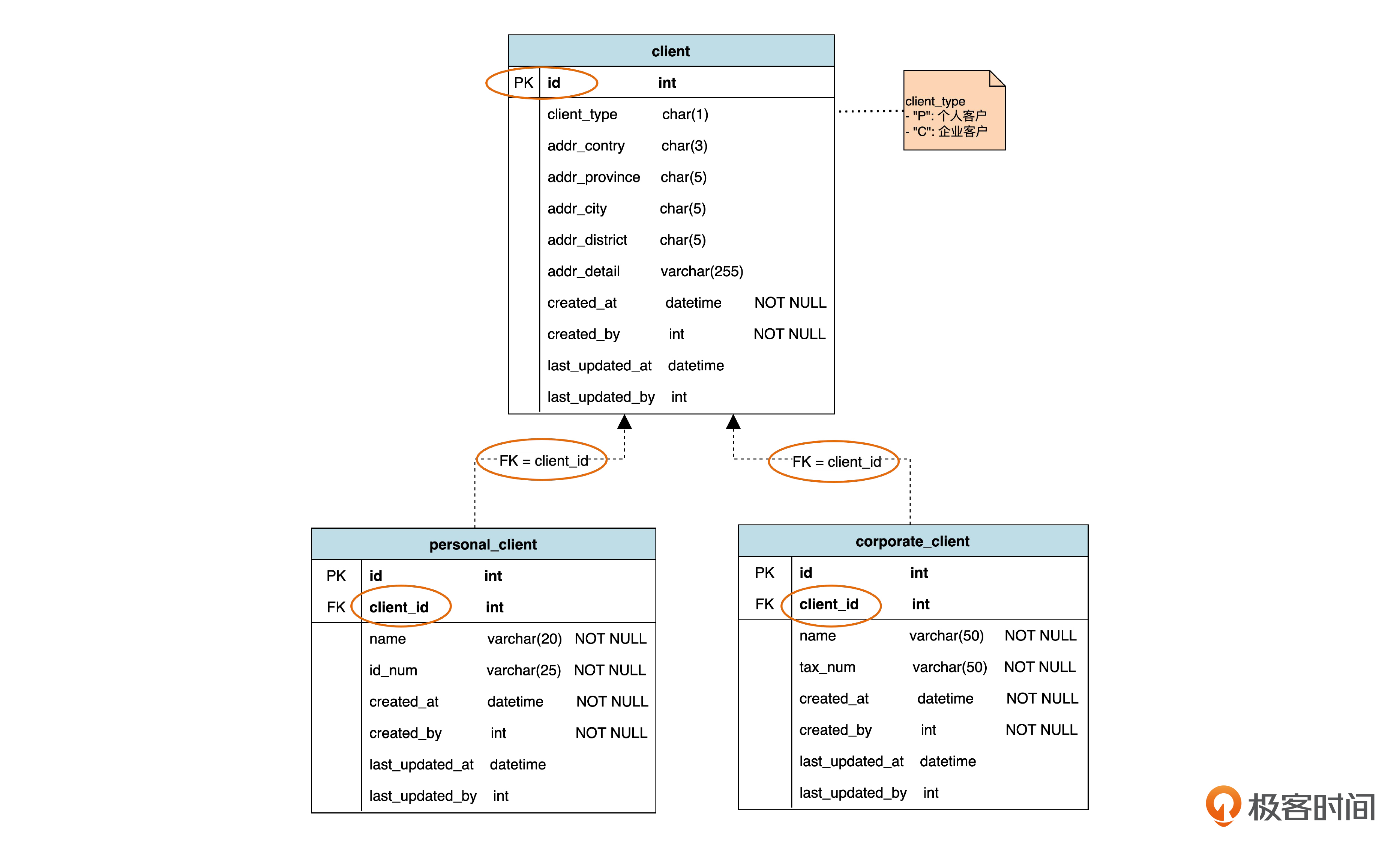 个人客户表和公司客户表自己有各自的主键,另外还有一个 client_id。这个 client_id 才是对应于父表中主键的外键。这时候,在子表里面,主键和外键是两个不同的字段,所以我们把这种策略称作“不共享主键”。