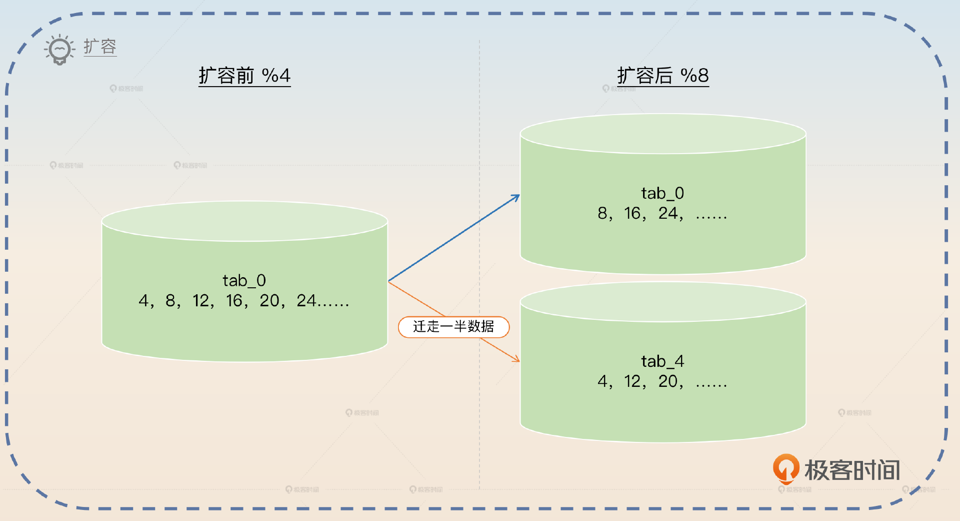 如果我们是从头开始学扩容,那么会非常复杂。但是好在前面你已经学过了数据迁移,所以扩容对你来说已经是一个比较容易掌握的东西了。
