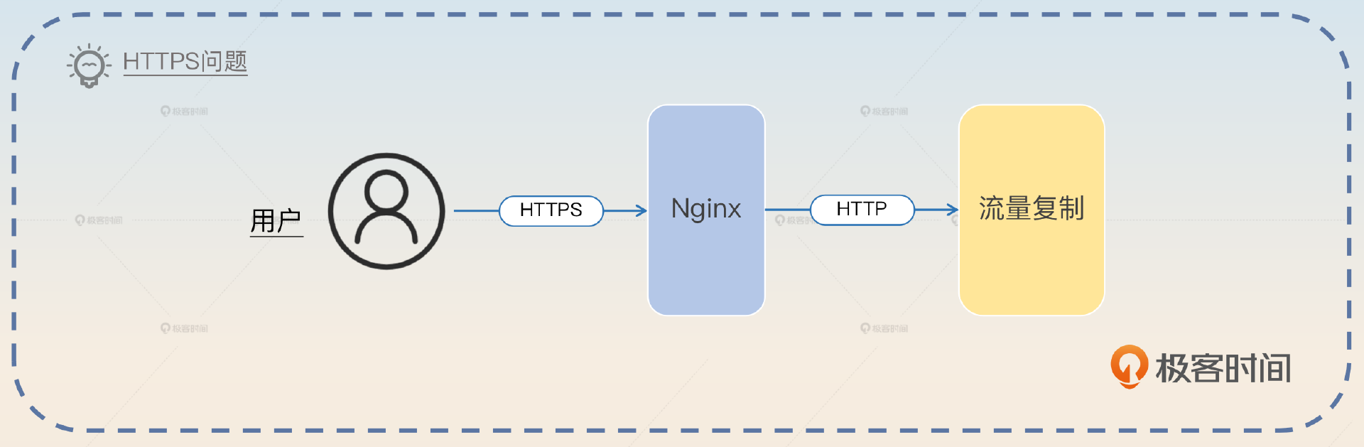 我这个方案是准备在 Nginx 后面接入流量复制。用户和 Nginx 之间是 HTTPS 通信,但是 Nginx 和后面的服务器之间是 HTTP 通信,所以就可以避开 HTTPS 的问题。