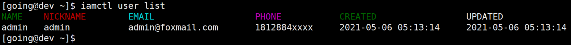 执行 iamctl user list 可以列出预创建的 admin 用户,如下图所示: