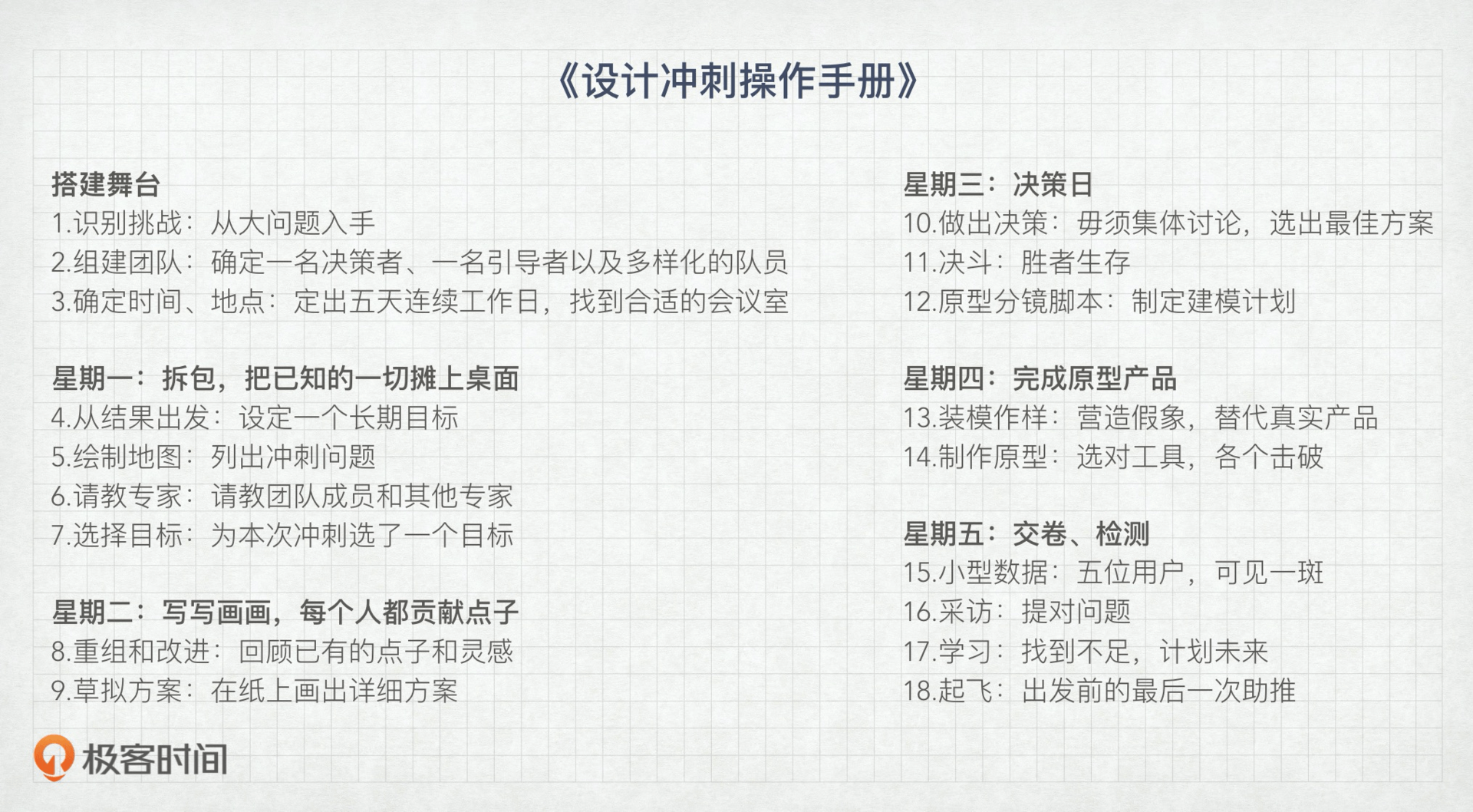 这一讲,我来用自己的语言为你讲解一下设计冲刺的思维逻辑和使用条件上的限制,如果你理解了这套逻辑,并且觉得有用、可以用到自己身上的话,可以再去看看书。