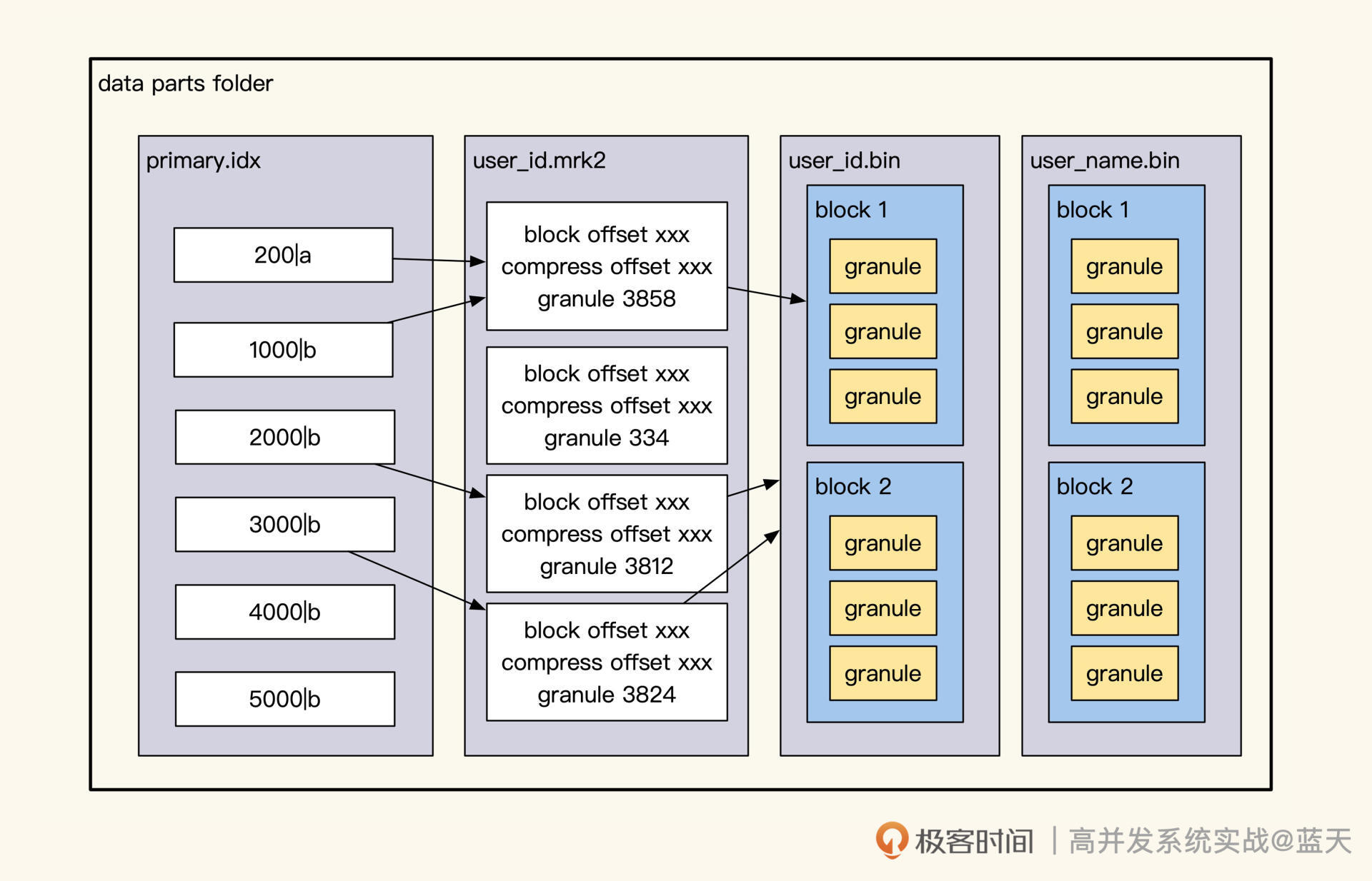 为了加快查询的速度,data parts内的主键索引(即稀疏索引)会被加载在内存中,并且为了配合快速查找数据在磁盘的位置,ClickHouse在data part文件夹中,会保存多个按字段名命名的mark文件,这个文件保存的是bin文件中压缩后的block的offset,以及granularity在解压后block中的offset,整体查询效果如下图: