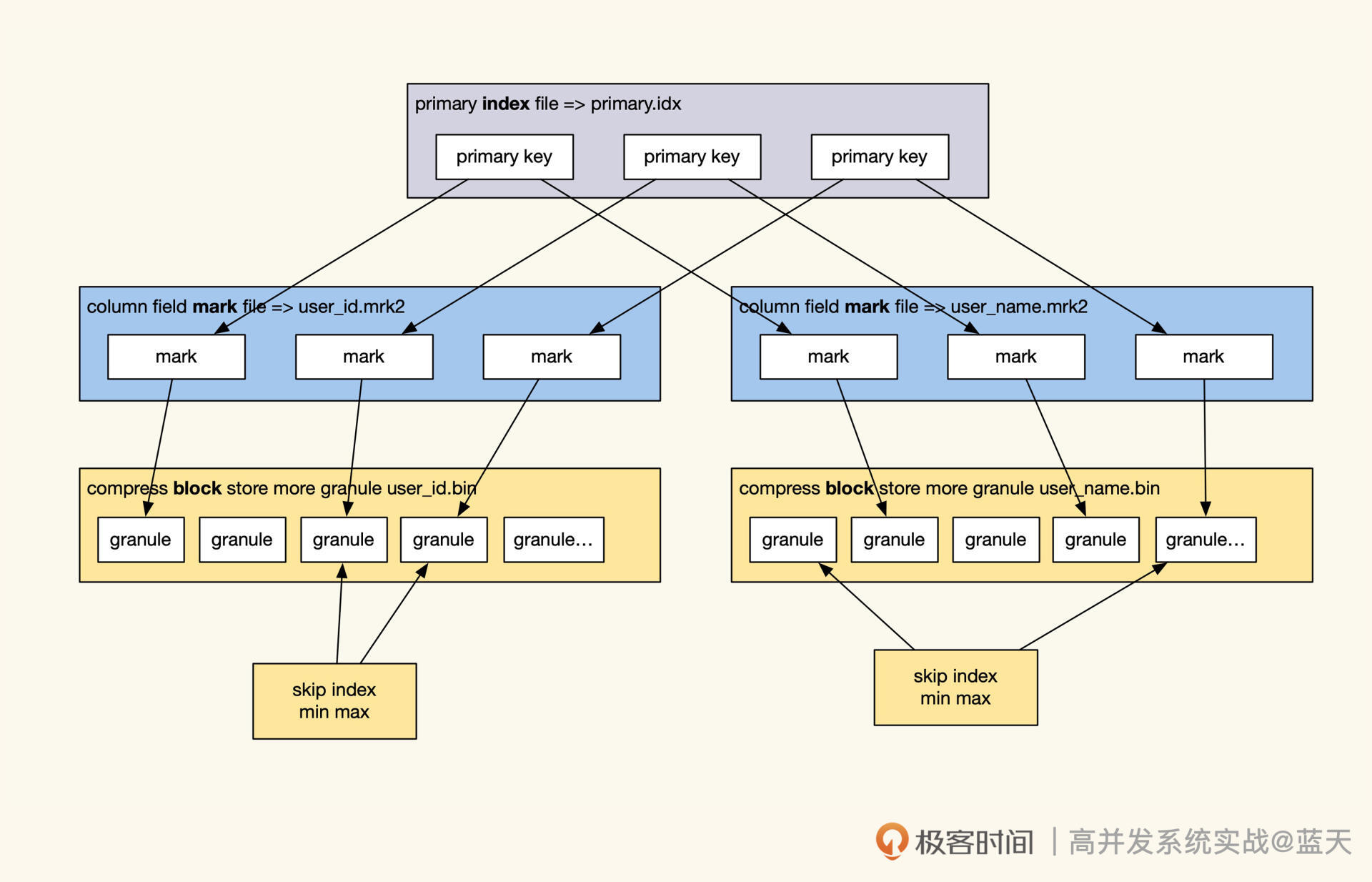 具体查询过程是这样的,我们先用二分法查找内存里的主键索引,定位到特定的mark文件,再根据mark查找到对应的block,将其加载到内存,之后在block里找到指定的granule开始遍历加工,直到查到需要的数据。
