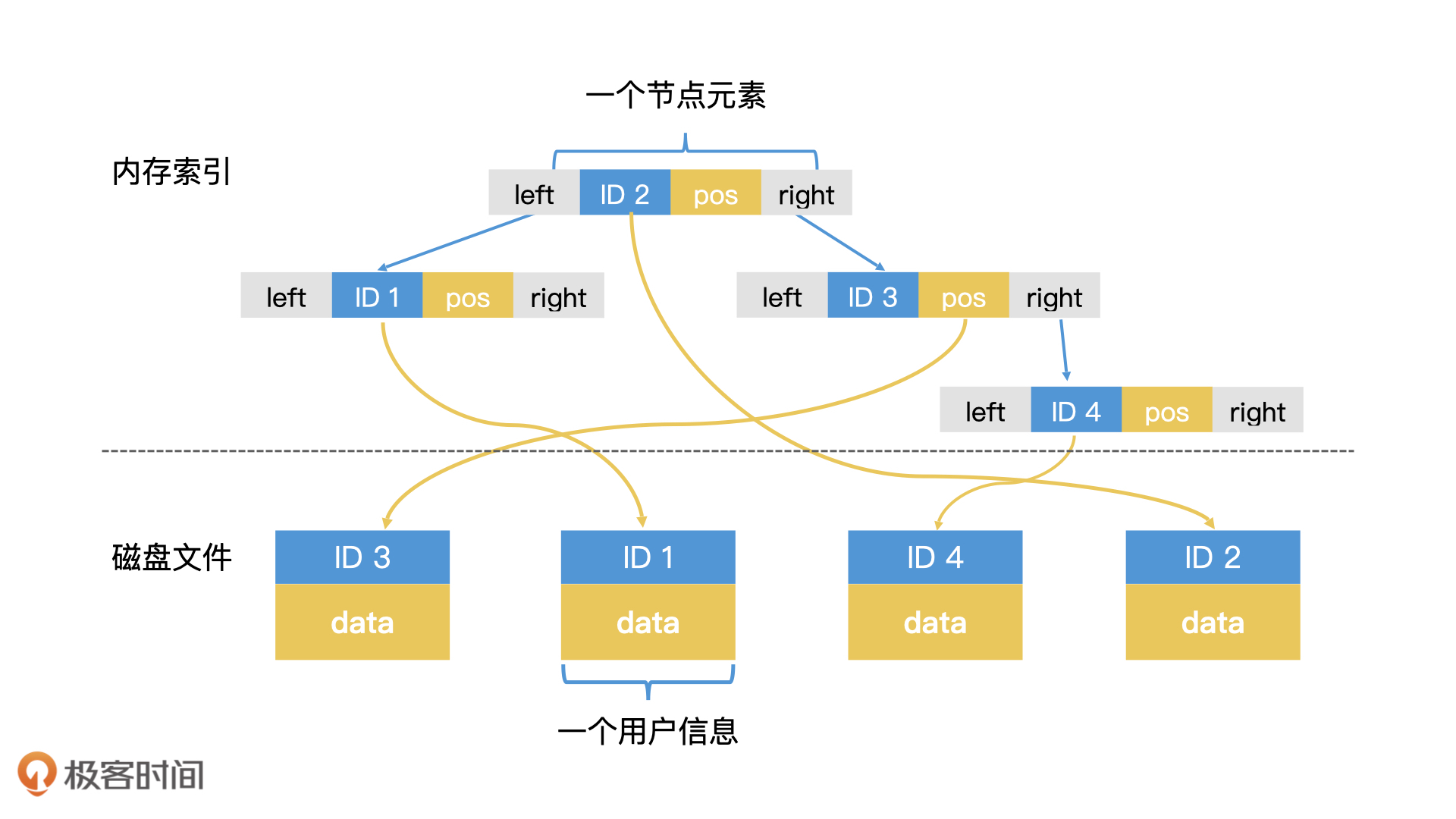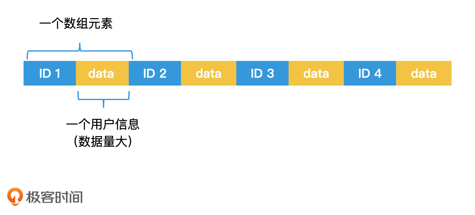 我们以查询用户信息为例。我们知道,一个系统中的用户信息非常多,除了有唯一标识的ID以外,还有名字、邮箱、手机、兴趣爱好以及文章列表等各种信息。一个保存了所有用户信息的数组往往非常大,无法全部放在内存中,因此我们会将它存储在磁盘中。