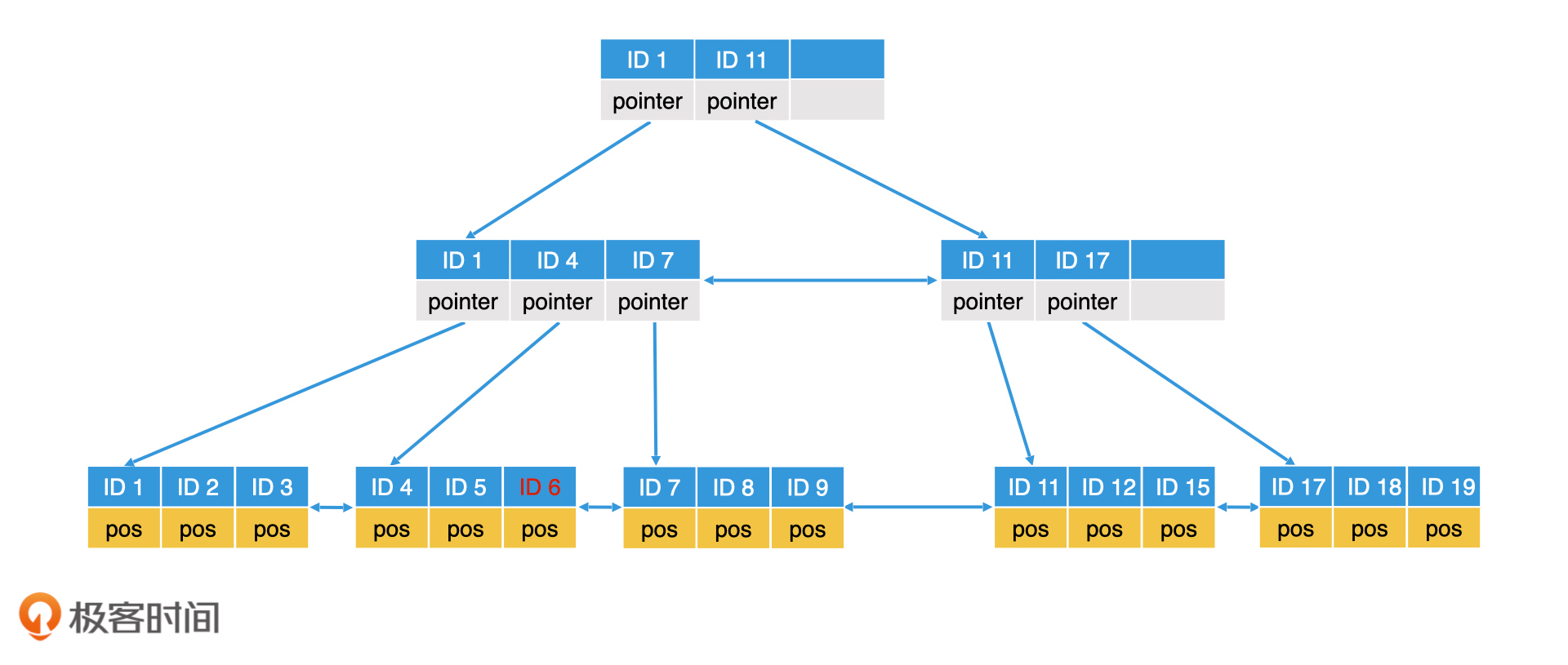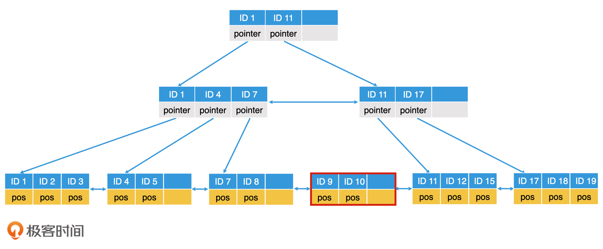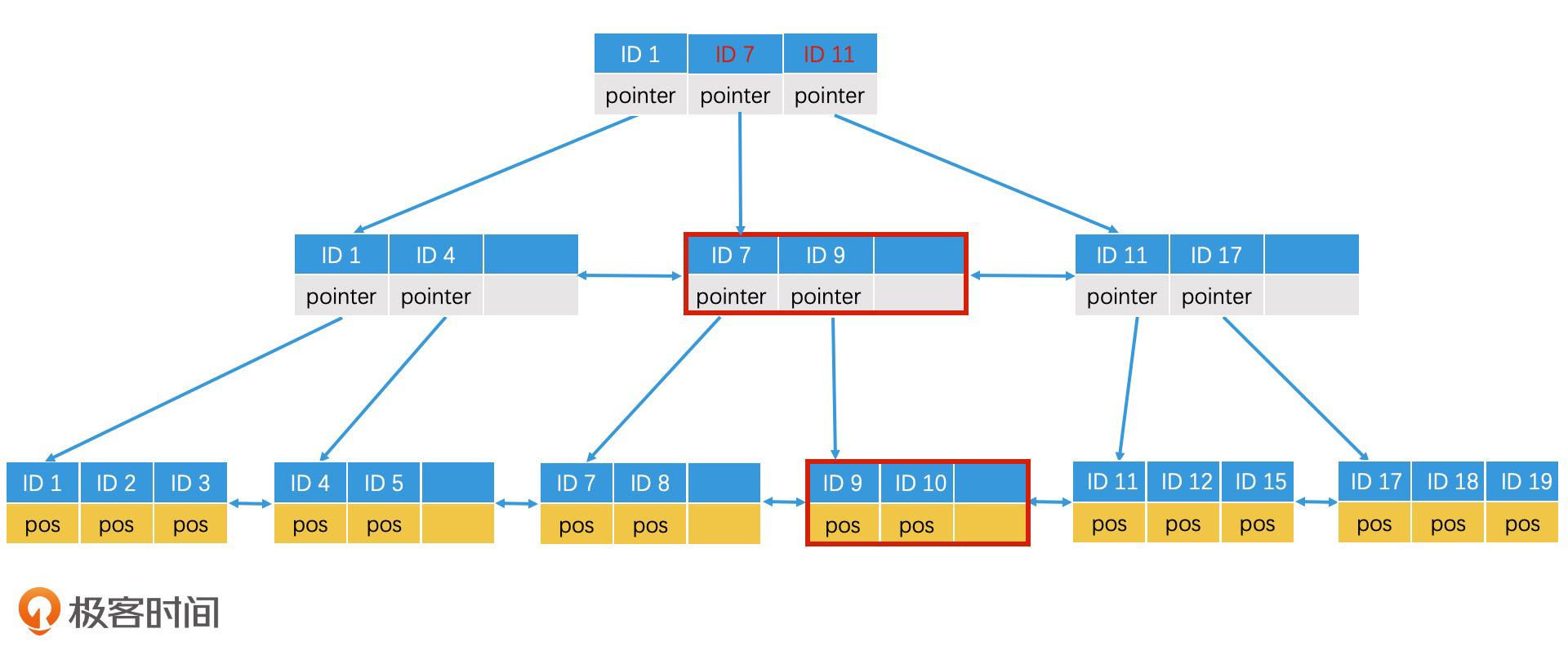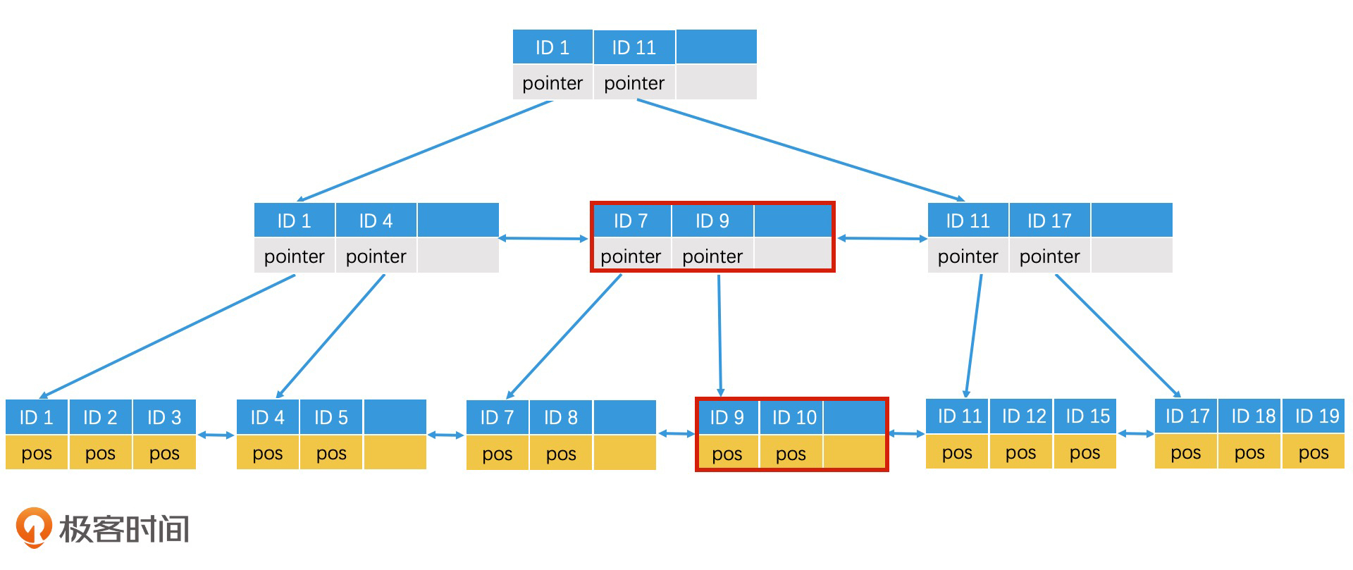 在数据频繁变化的场景中,有序数组并不是一个最好的选择,二叉检索树或者哈希表往往更有普适性。但是,哈希表由于缺乏范围检索的能力,在一些场合也不适用。因此,二叉检索树这种树形结构是许多常见检索系统的实施方案。那么,上图中的线性索引结构,就变成下图这个样子。