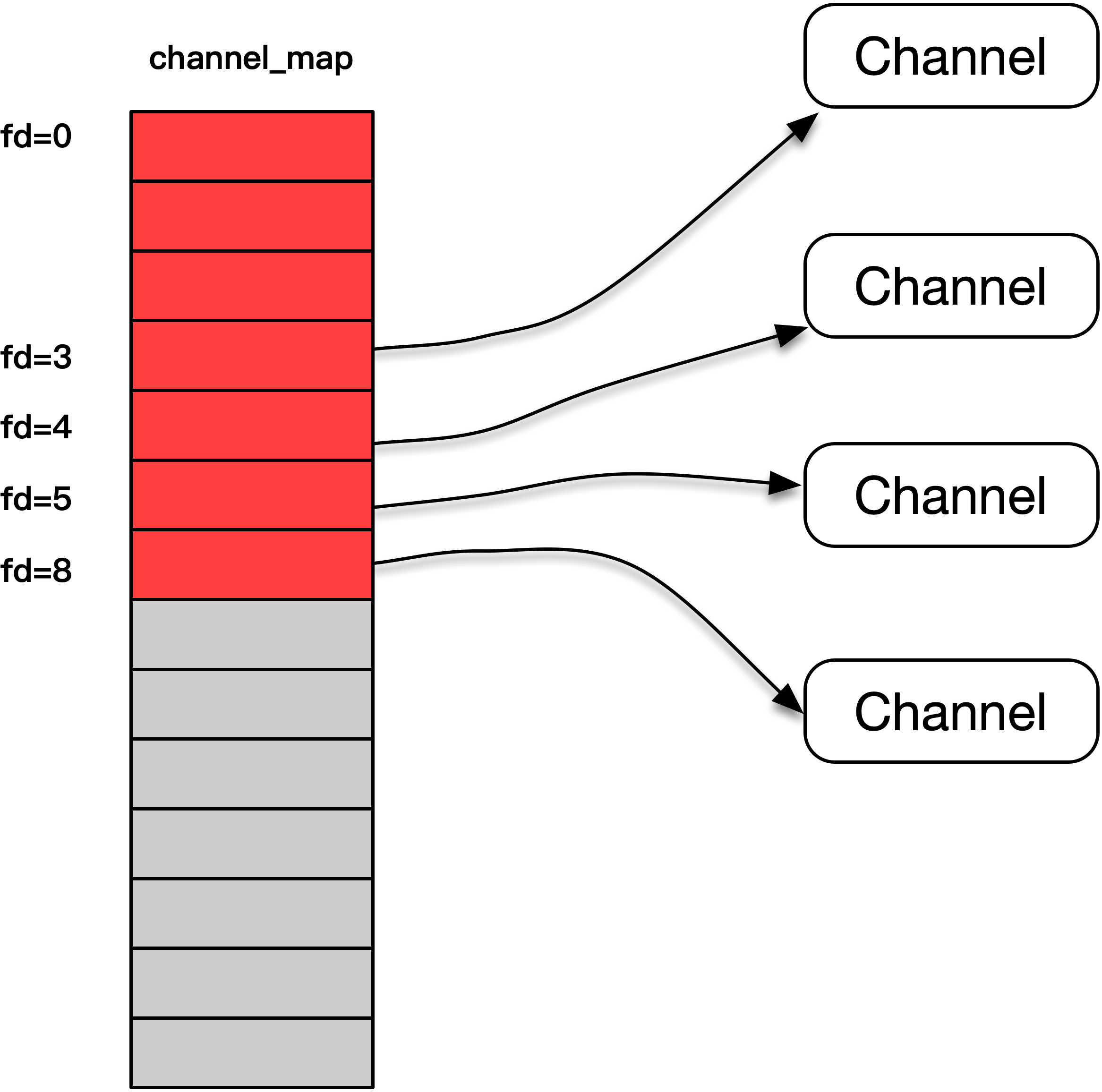 channel_map实际上是一个指针数组,这个数组里面的每个元素都是一个指针,指向了创建出的channel对象。我们用数据下标和套接字进行了映射,这样虽然有些元素是浪费了,比如stdin,stdout,stderr代表的套接字0、1和2,但是总体效率是非常高的。