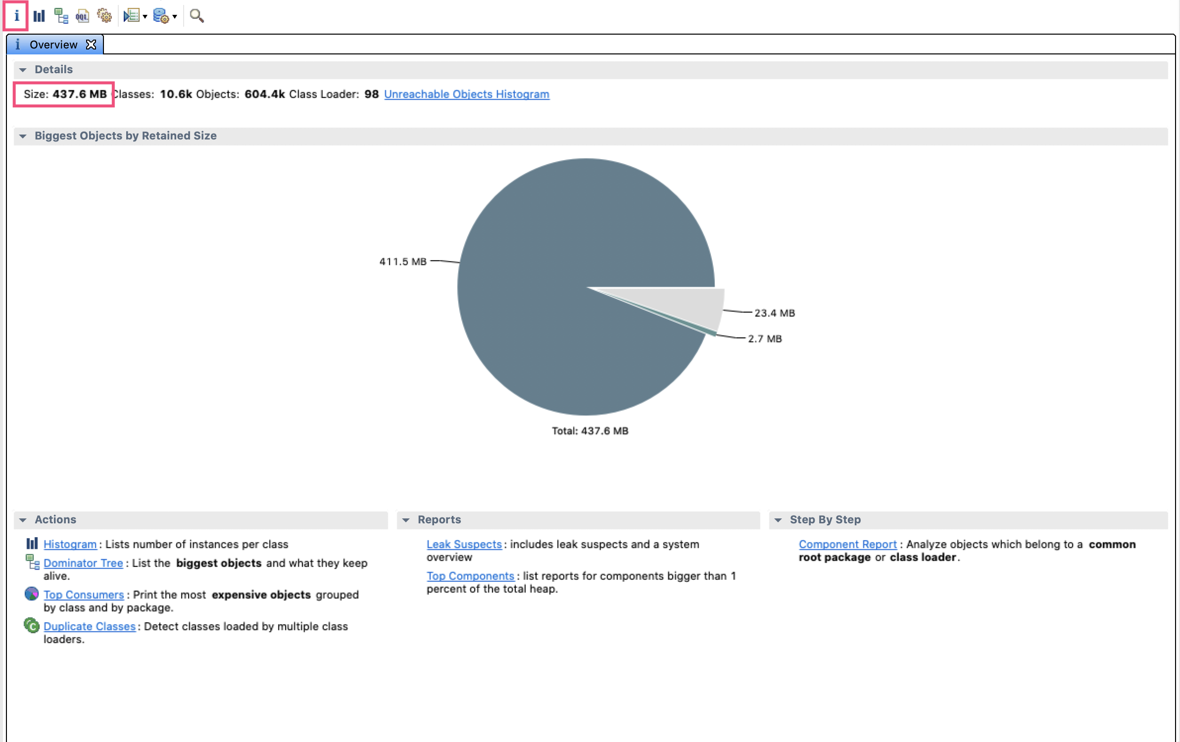 首先,用MAT打开后先进入的是概览信息界面,可以看到整个堆是437.6MB: