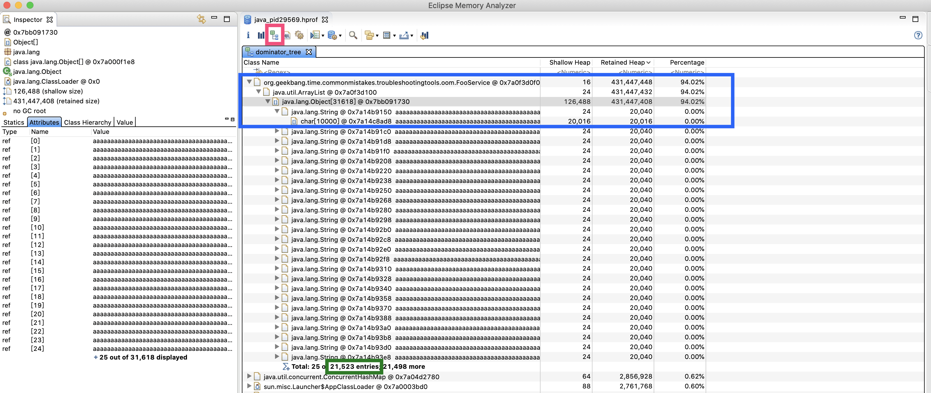 可以看到,第一位就是FooService,整个路径是FooSerice->ArrayList->Object[]->String->char[](蓝色框部分),一共有21523个字符串(绿色方框部分):
