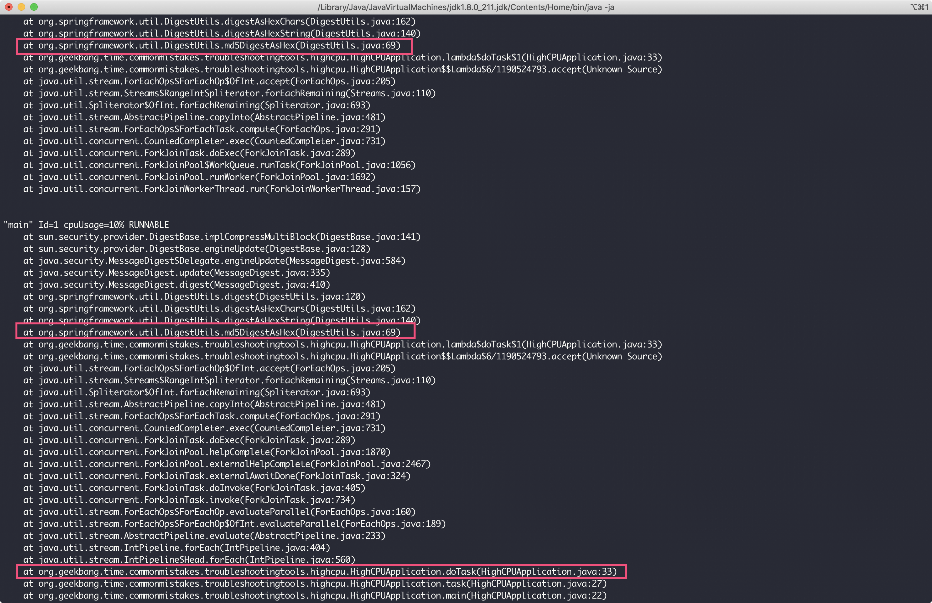 由于主线程也参与了ForkJoinPool的任务处理,因此我们可以通过主线程的栈看到需要重点关注org.geekbang.time.commonmistakes.troubleshootingtools.highcpu.HighCPUApplication类的doTask方法。