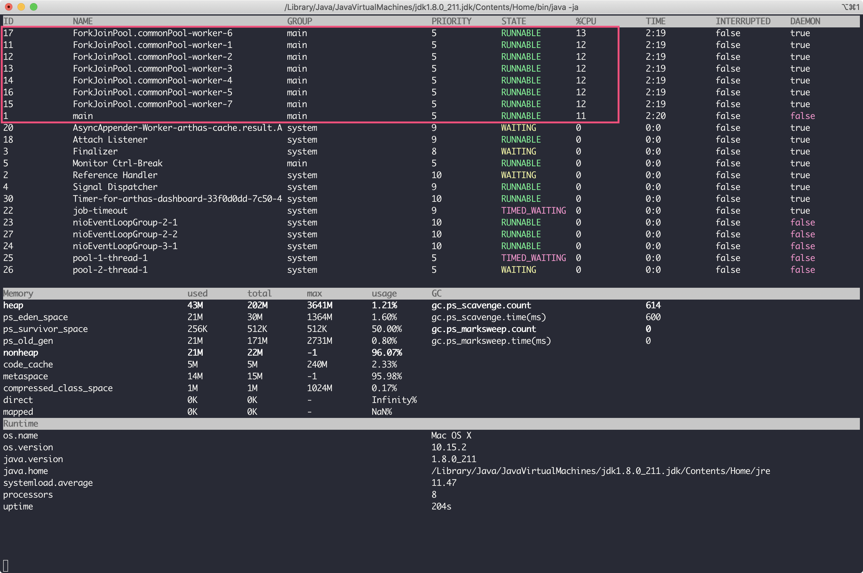 可以看到,CPU高并不是GC引起的,占用CPU较多的线程有8个,其中7个是ForkJoinPool.commonPool。学习过[加餐1]的话,你应该就知道了,ForkJoinPool.commonPool是并行流默认使用的线程池。所以,此次CPU高的问题,应该出现在某段并行流的代码上。