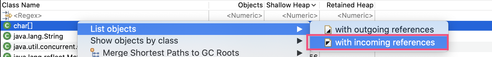 在char[]上点击右键,选择List objects->with incoming references,就可以列出所有的char[]实例,以及每个char[]的整个引用关系链: