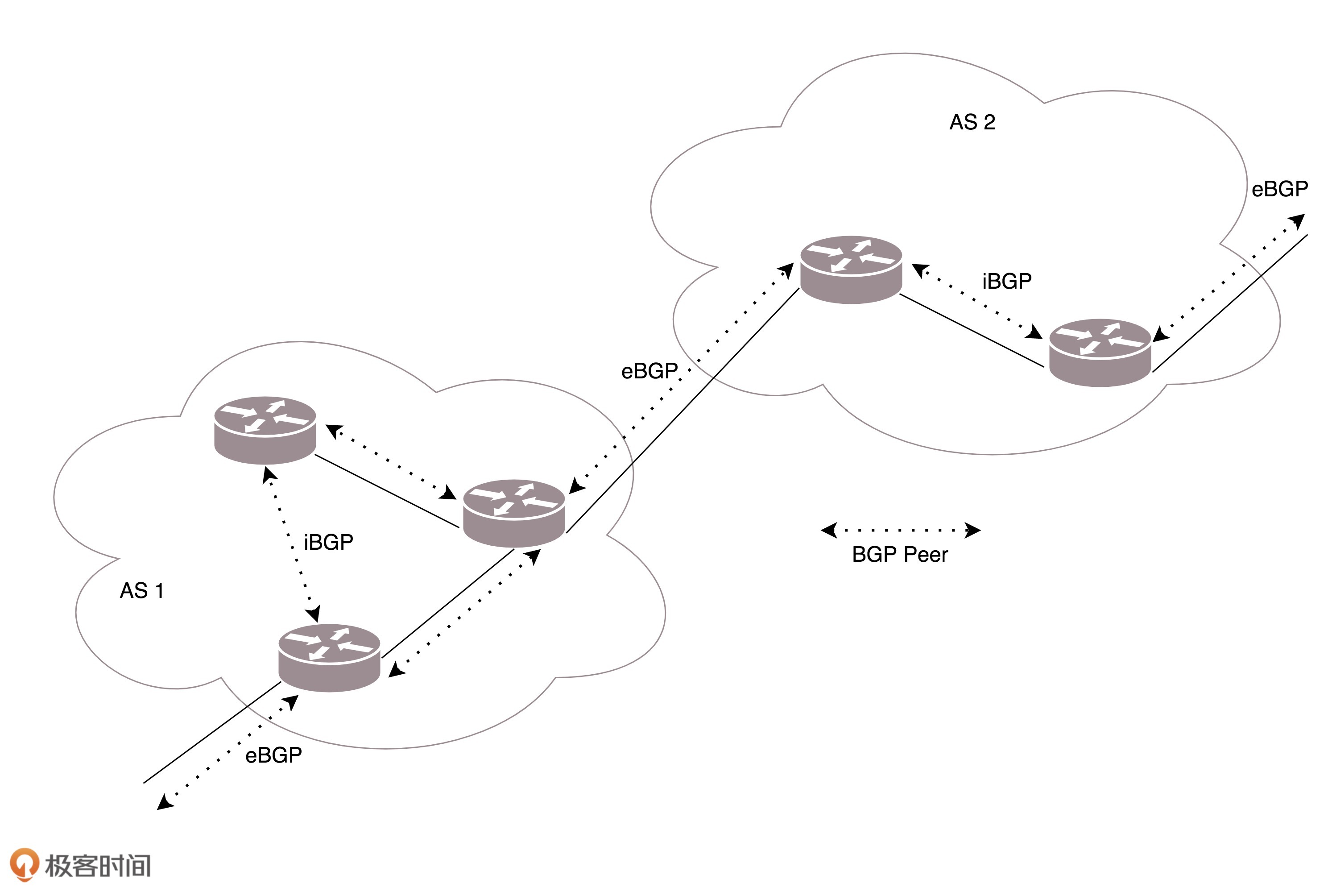 **BGP又分为两类,eBGP和iBGP。**自治系统间,边界路由器之间使用eBGP广播路由。内部网络也需要访问其他的自治系统。边界路由器如何将BGP学习到的路由导入到内部网络呢?就是通过运行iBGP,使得内部的路由器能够找到到达外网目的地的最好的边界路由器。