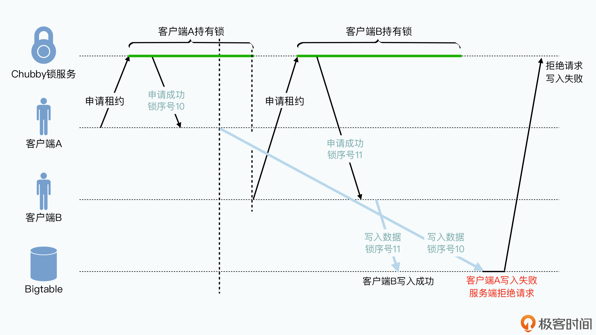 它本质上是一个乐观锁,或者在很多地方也叫做Fencing令牌。这种方式是这样的:客户端在获取Chubby的锁的时候,就要拿到对应的锁的序号,比方说23。在发送请求的时候,客户端会带上这个序号。而当Chubby把锁给了别的客户端之后,对应的锁的序号会变大,变成了24。而我们对应的业务服务,比如Bigtable呢,也要记录每次请求的锁序列号,通过对比锁序列号来确定是否会有之前的锁,尝试去覆盖最新的数据。当遇到这种情况的时候,我们姗姗来迟的来自上一个锁的客户端请求,就会被业务服务拒绝掉。