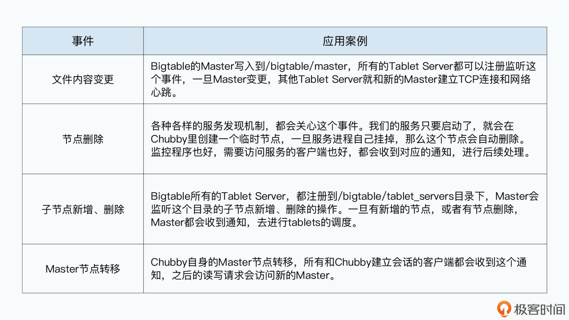 这是一个典型的设计模式中的观察者模型(observer pattern)。客户端可以注册它自己对哪些事件感兴趣,比如特定目录或者文件的内容变更,或者是或者是某个文件或者目录被删除了,一旦这些事件发生了,Chubby就会推送对应的事件信息给这些应用客户端,应用客户端就可以去做类似于调度Tablet Server这样的操作了。
