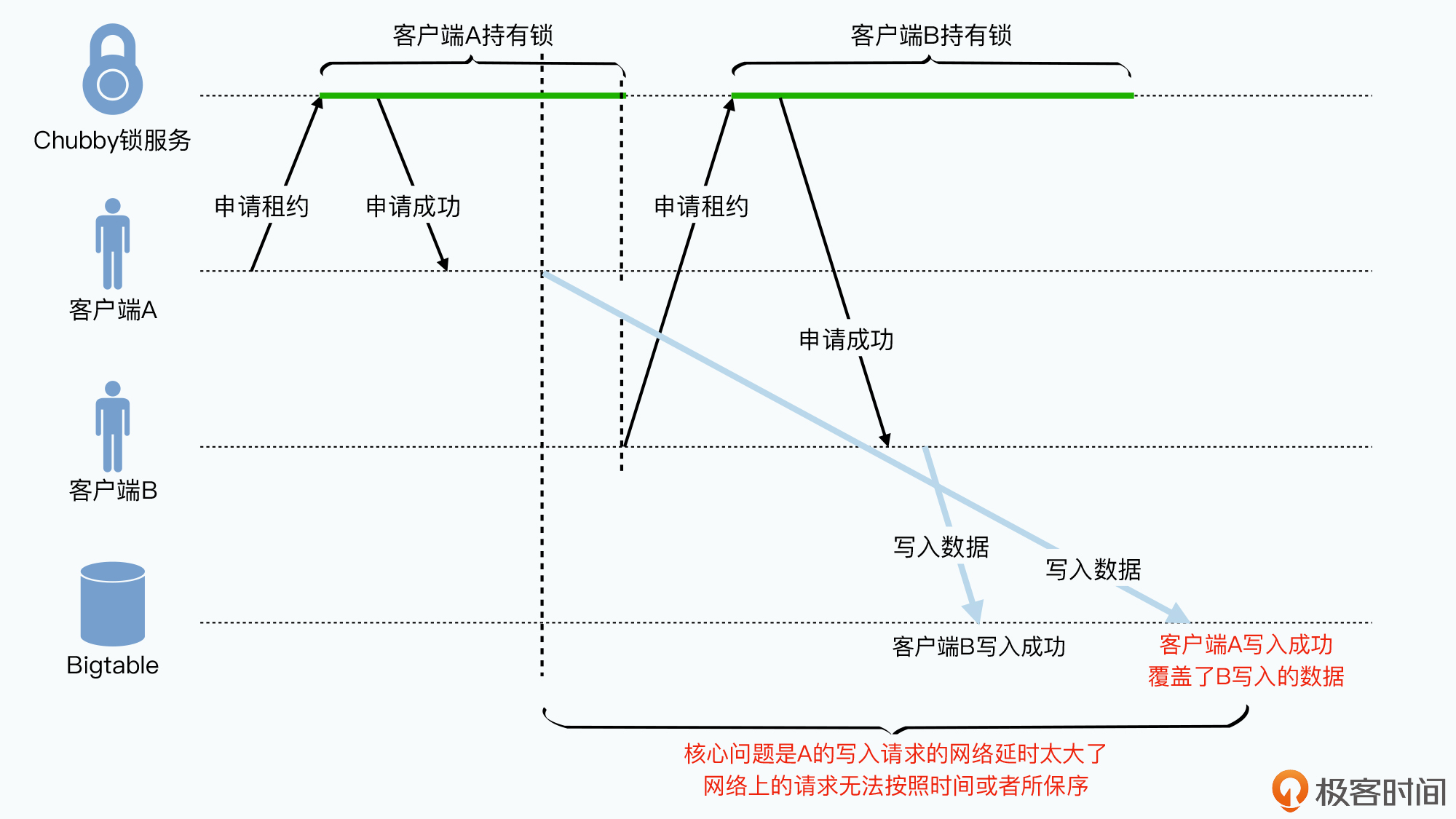- 而当这个写入请求X还在路上的时候,客户端A的“租约”到期了。这个时候,另外一个客户端B获取到了对应的锁,然后它往这个Bigtable的geektime的行里,写入了数据Y。