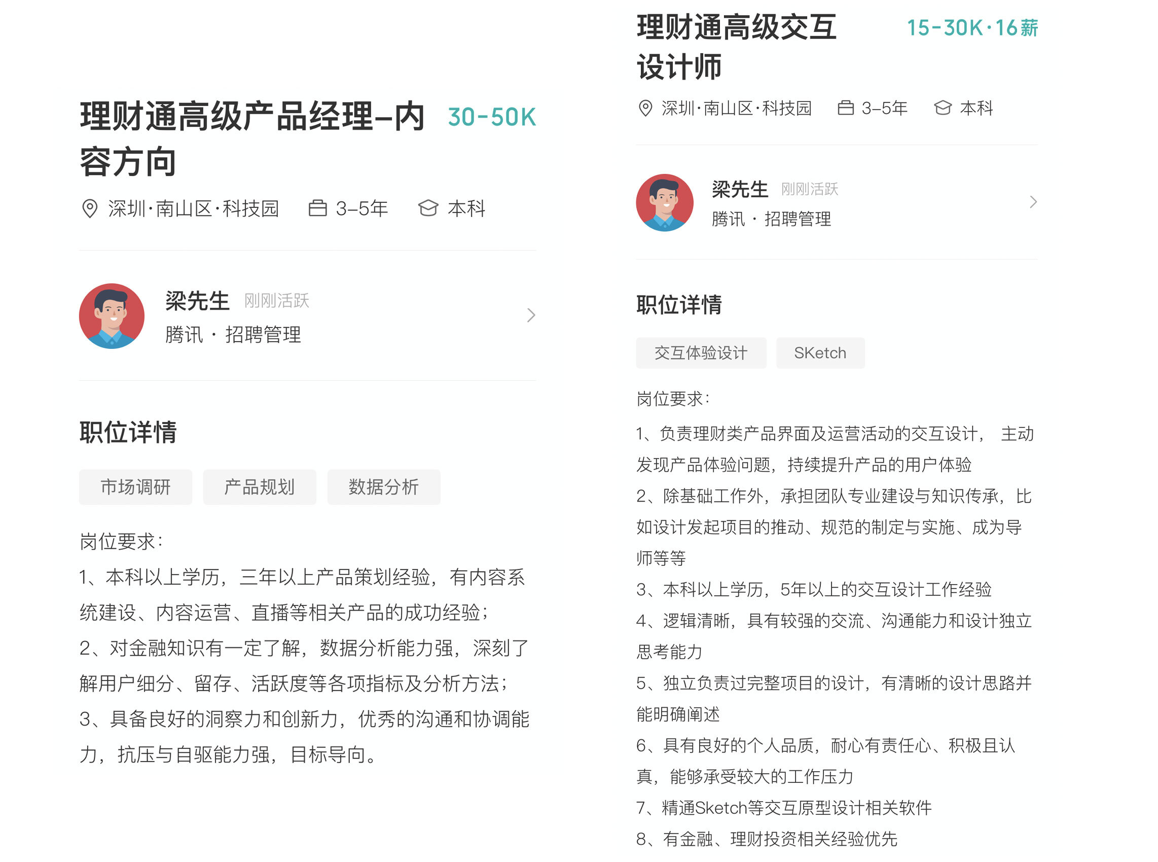 首先,我们要知道,市场对产品经理和交互设计师的核心能力要求是不同的,为了让你更直观地感受这个不同,我找来了市场的招聘信息,以腾讯理财通为例。
