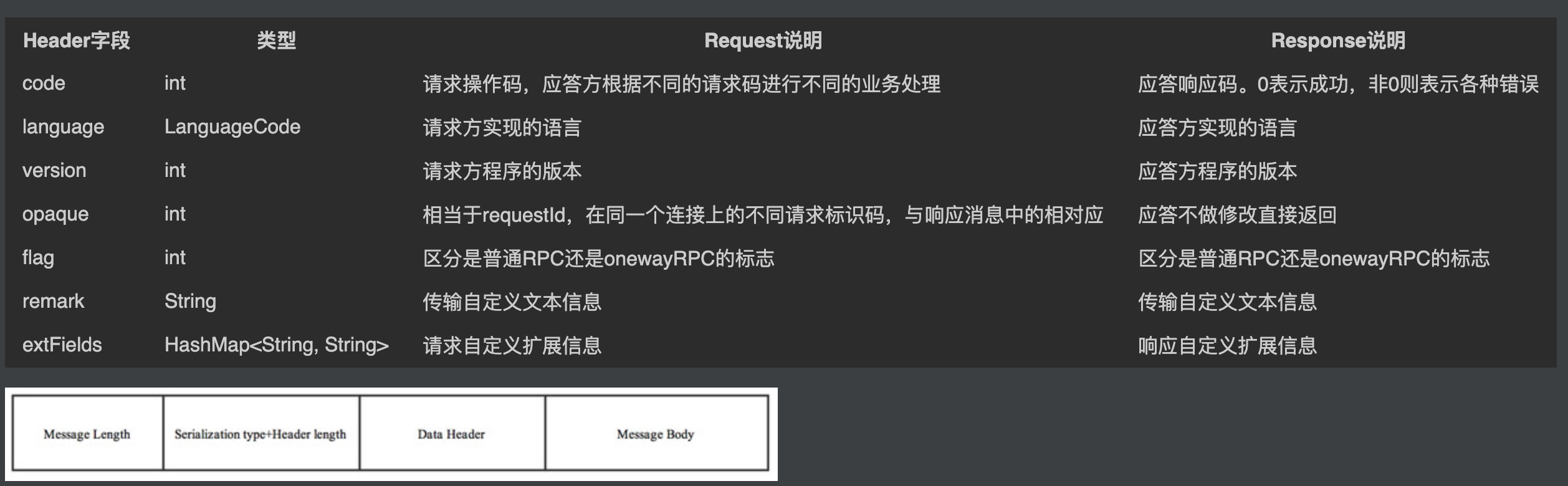 如下图所示,自定义的Remoting协议的整体结构,包括协议头(消息头)和协议体(消息体)两部分。消息头包含请求操作码、版本、标记、扩展信息等通用信息。消息体包含的就是各个请求的具体内容,比如生产请求就是包含生产请求的请求数据,是一个复合的结构。