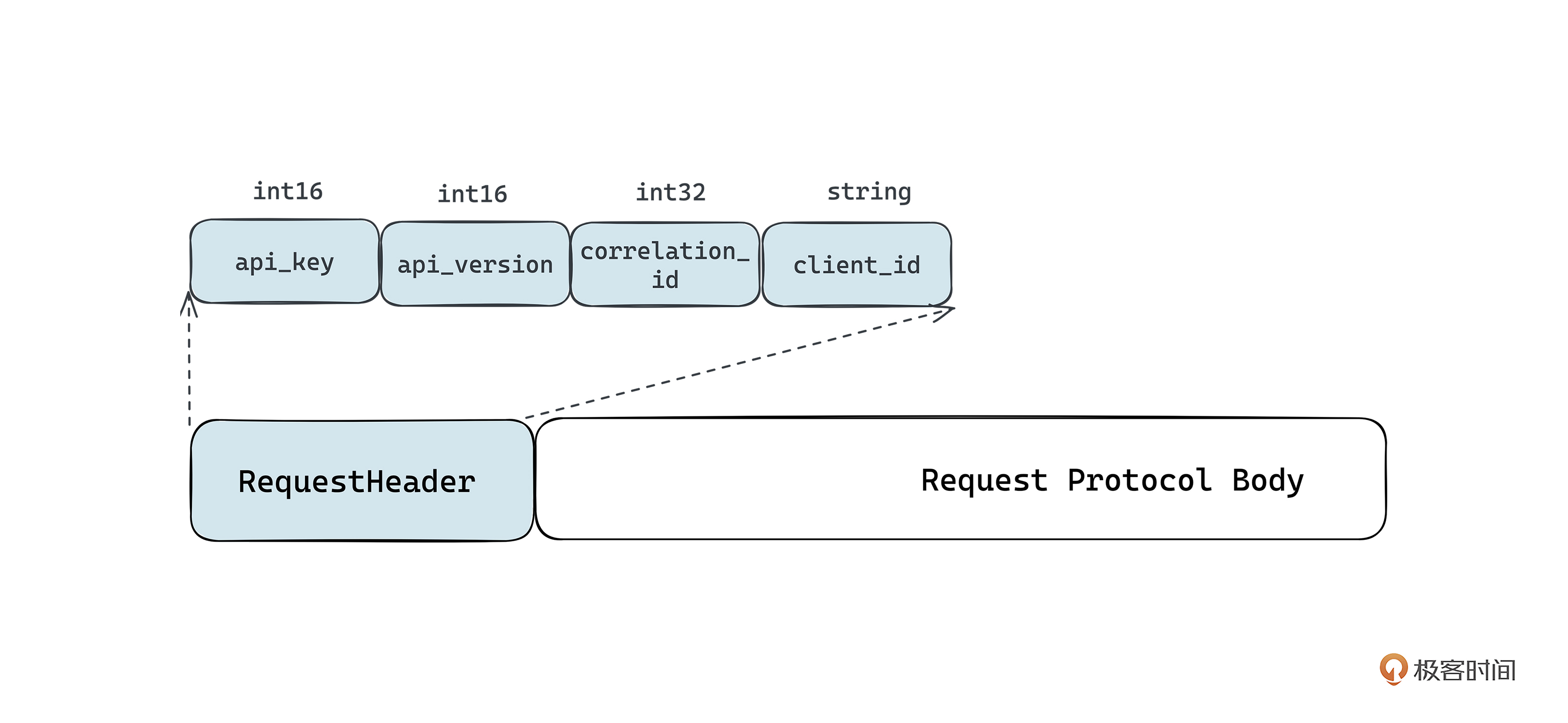 接下来,我们分析一下Kafka协议的请求头和返回头的内容,让你对协议头的设计有个更直观认识。如下图所示,Kafka V2 协议的请求头中携带了四个信息。