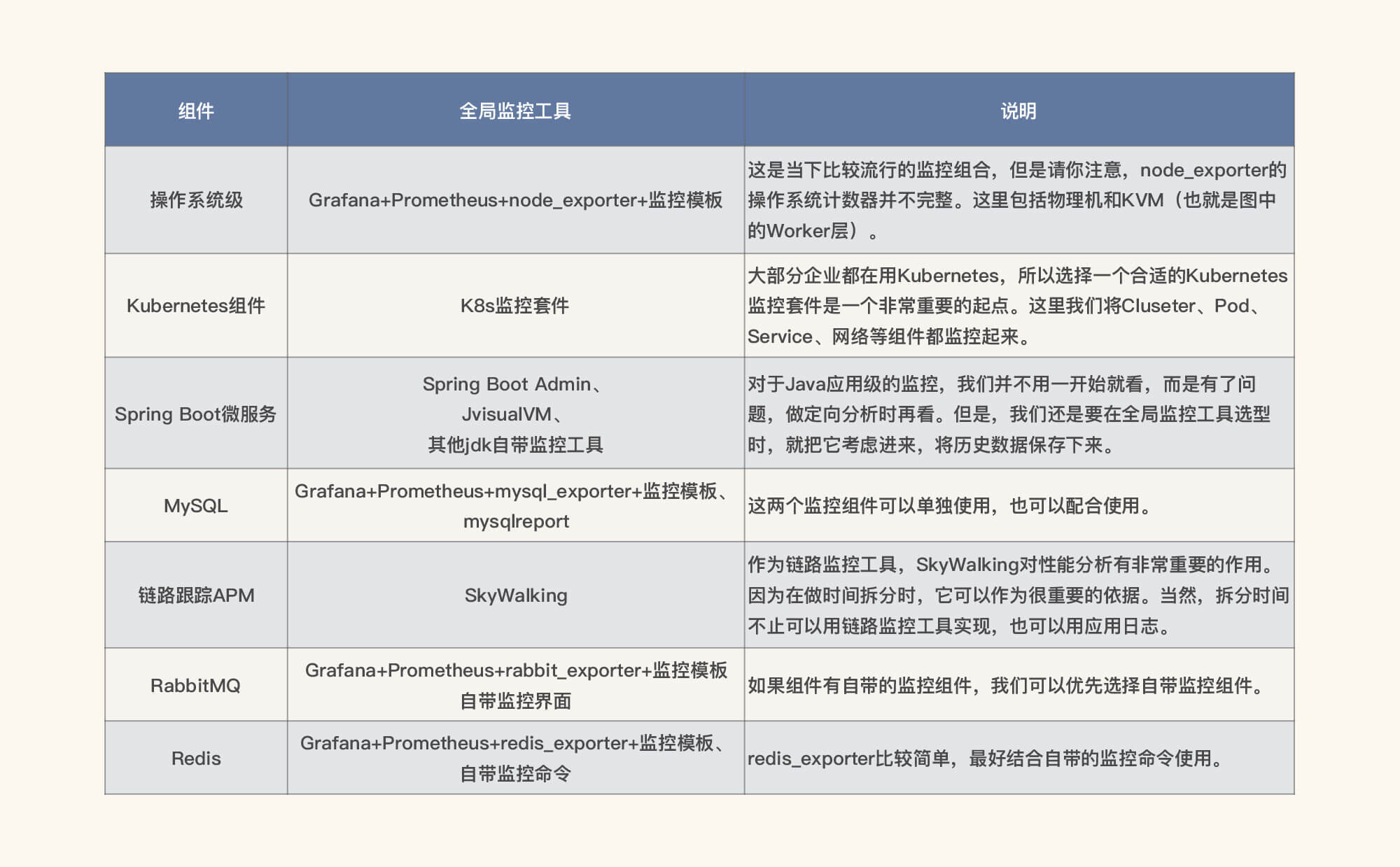 基于上面的组件列表,我们接下来要选择相应的监控工具。有一点你要注意,这是我们选择的第一层监控工具,也就是全局监控工具。对于定向监控中需要的工具,我们现在还无法确定,因为定向监控工具取决于性能分析过程中有什么问题。