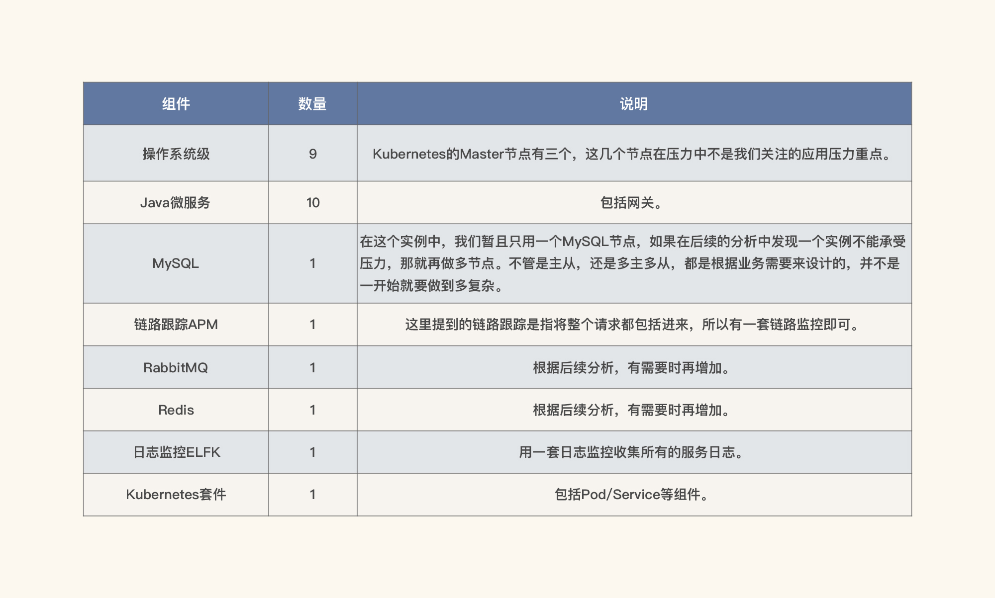 从上面的信息中,我们要列出需要监控的组件,也就是下面的这张表格。请你注意,对于上面的各层实例,我们现在只配置了一个,但并不是说我们只需要一个,在后续的测试过程中,当需要增加实例时,我们再增加。