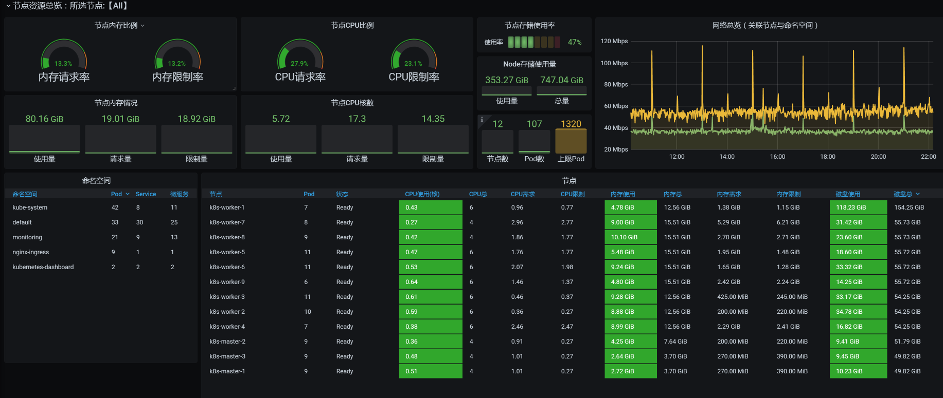 类似这样的模板有很多,我就不一一列举了。虽然各个工具展示的方式不同,但都能达到我们全局监控Kubernetes的目标。所以,我们只需要选择一个合适自己业务系统的Kubernetes监控套件就可以了。