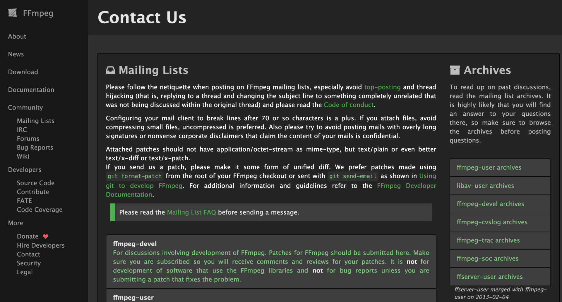 ffmpeg-devel列表里,主要是以Patch为沟通的基础,在这里面提需求几乎没人理,反馈Bug也没人理,但是你修改了FFmpeg内部的代码的话,做成patch发到这个列表里,获得回应的概率会高一些。