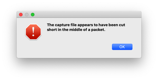- 用Wireshark打开抓包文件,如果遇到cut short in the middle of a packet的提示,也不用担心,因为现在我们知道,这不是大问题;