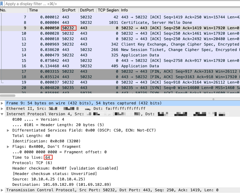 所以,我们只要看一下抓包文件中任何一个客户端报文(也就是源端口为高端口)的TTL,如果它是64、128或255,那说明这个抓包文件就是在客户端做的。反之,就是在服务端做的。