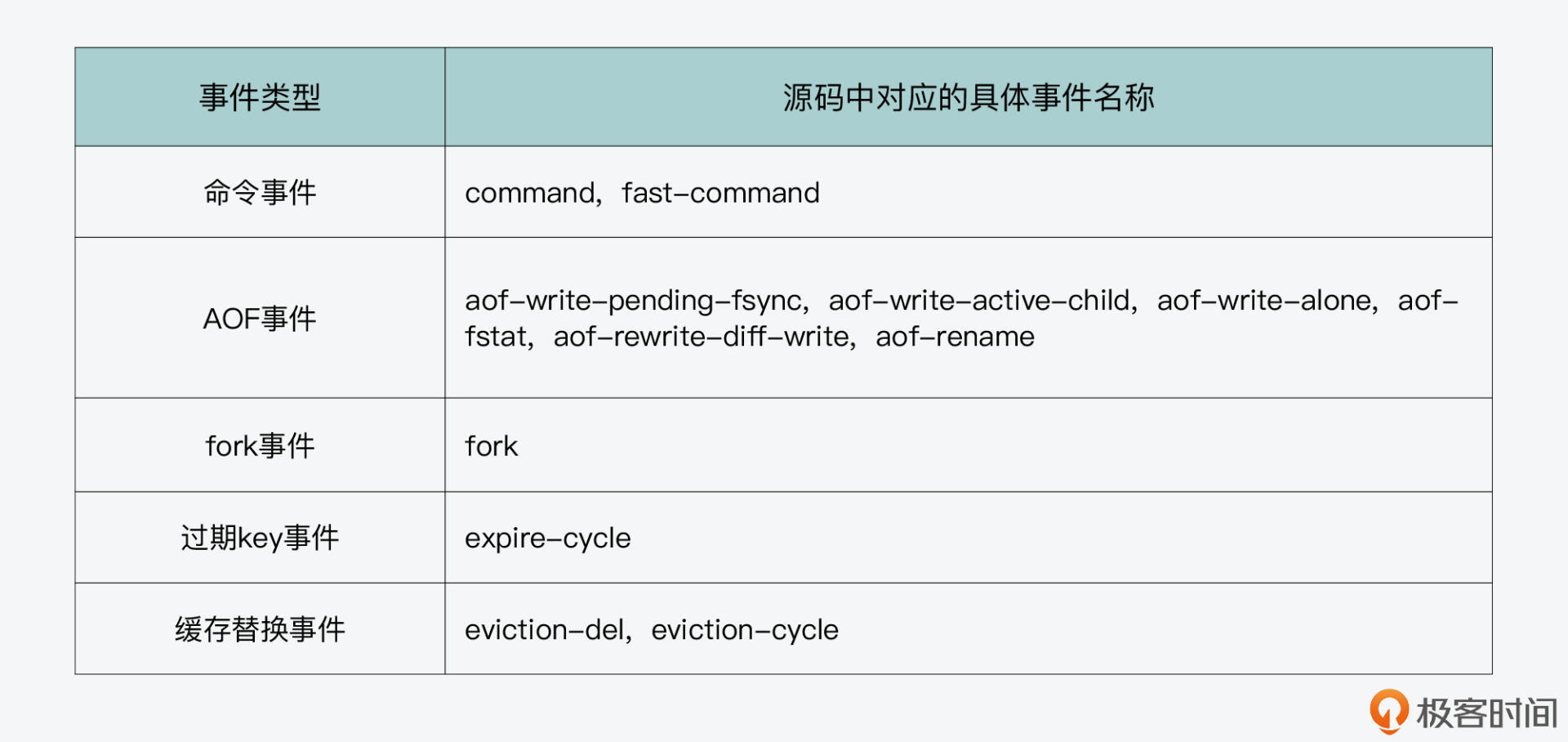实际上,Redis在运行过程中,以下表格中给出的几类事件都会导致Redis变慢,我们通常也把这些事件称为延迟事件。你可以参考表格中的这些事件类型,以及它们在源码中对应的事件名称。