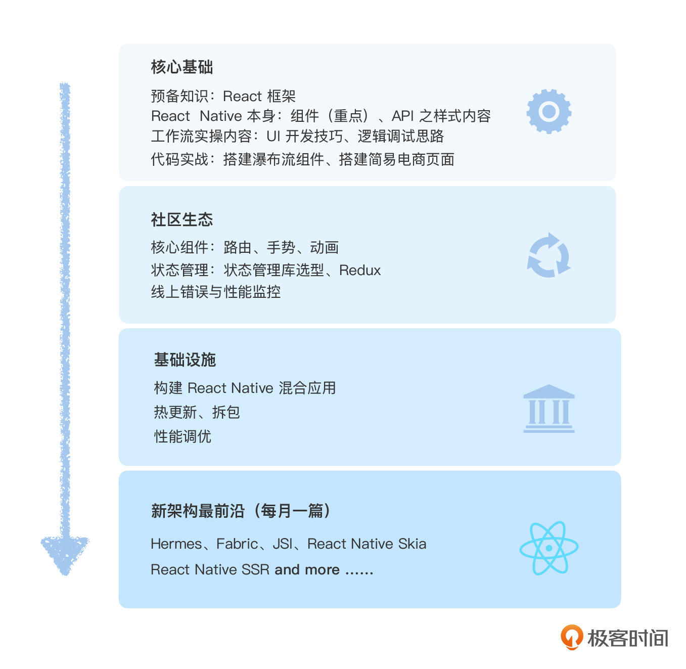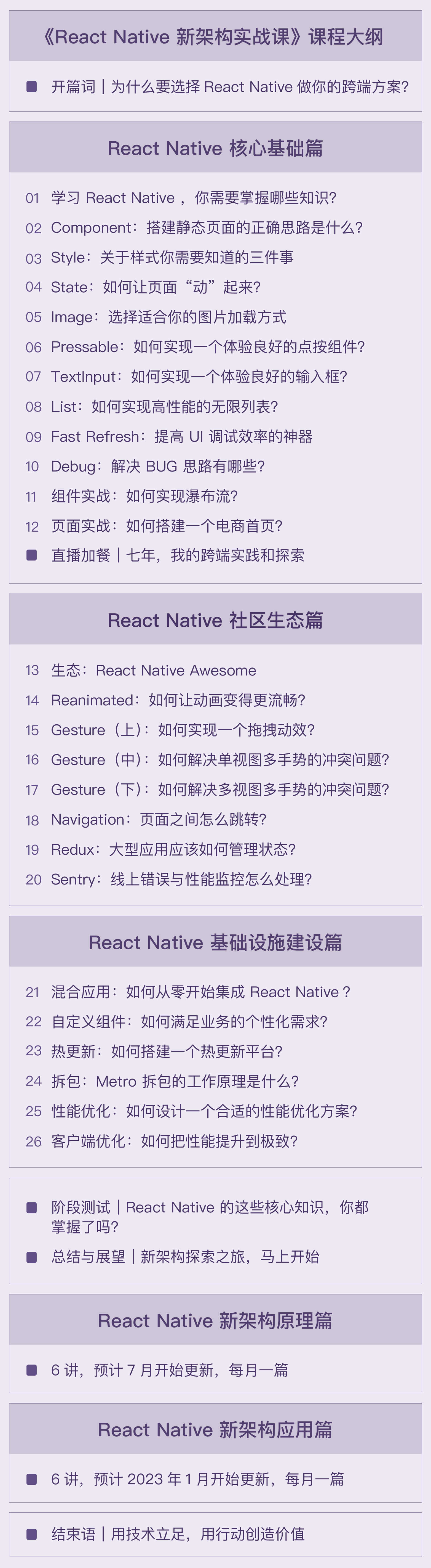 于是,我想到一个办法,先用 24 讲把 React Native 完整地给你介绍一遍,再用一年的时间,用12 讲的内容和你一起跟进 React Native 新架构最前沿的变化和进展。