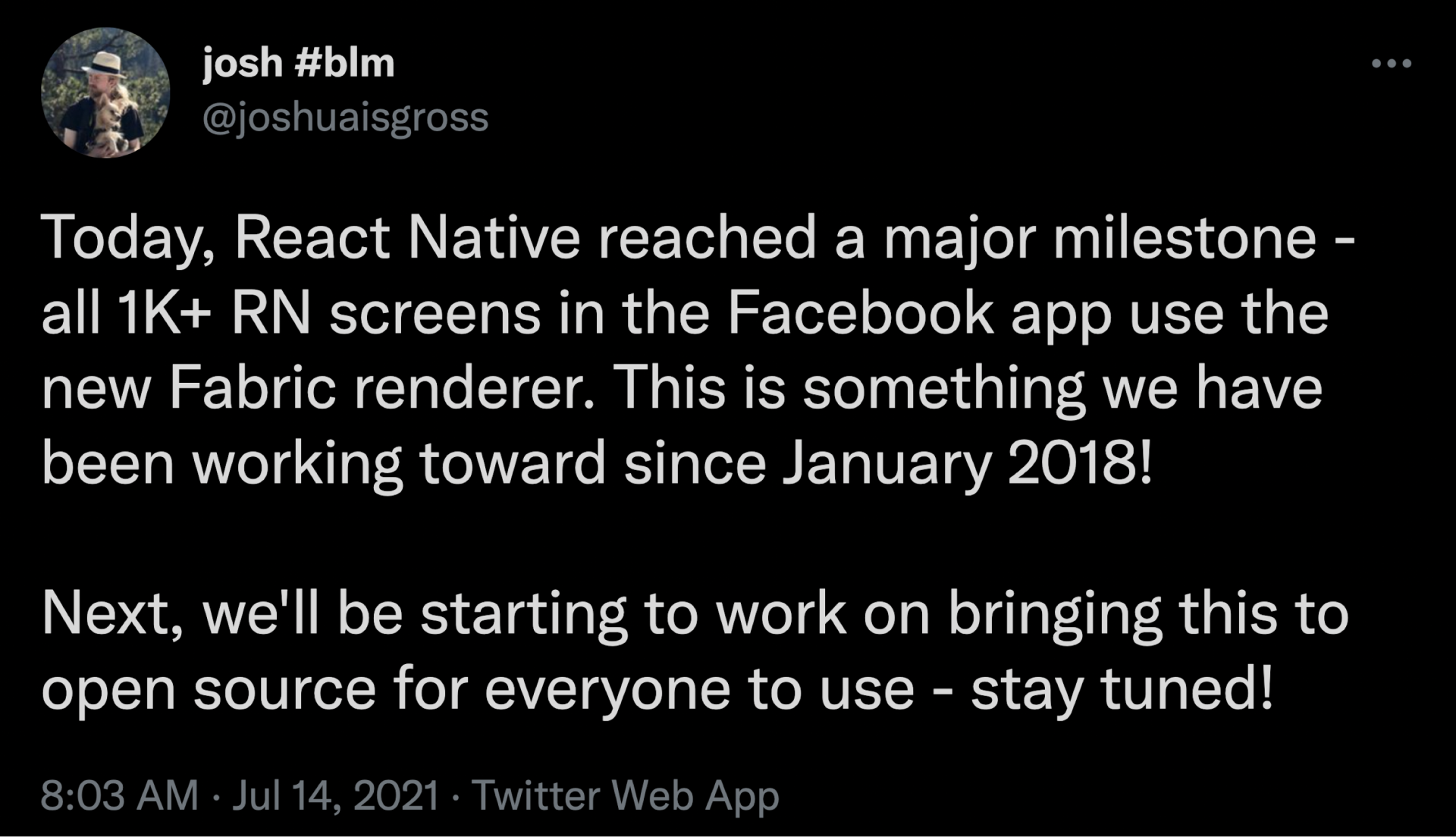 2021 年 7 月,经历 4 年漫长的等待,当我得知 React Native 新架构已经在 Facebook 落地的消息时,真是万分激动,期待已久的 React Native 新架构终于要来了,于是我马上开始了新架构的调研。